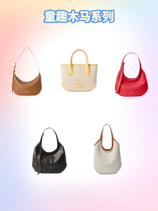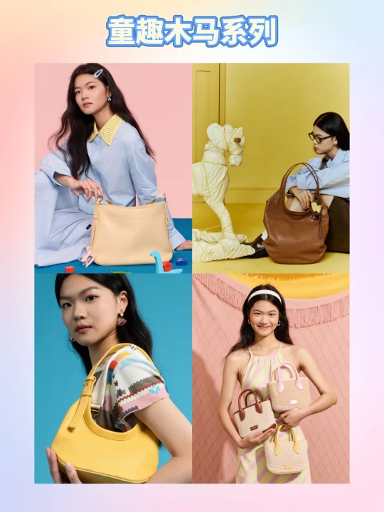 以童年记忆中的木马摇椅为灵感,延续品牌的趣味基因。提取木马底部弧线,让整体造型更显灵动玩味。通过"减负"工艺,使包身自然垂坠,散发慵懒随性的气息。