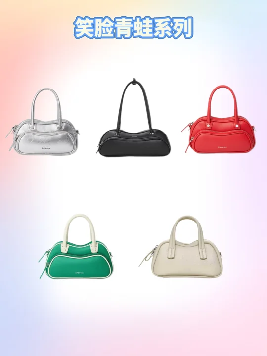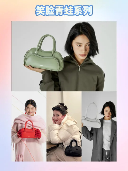 以“洋溢的笑脸”为灵感原点,巧妙融合青蛙笑脸弧线与波士顿包型,双层包袋设计像青蛙开怀大笑,两颗小圆钉点睛像灵动双眼,有趣又不失实用性能。