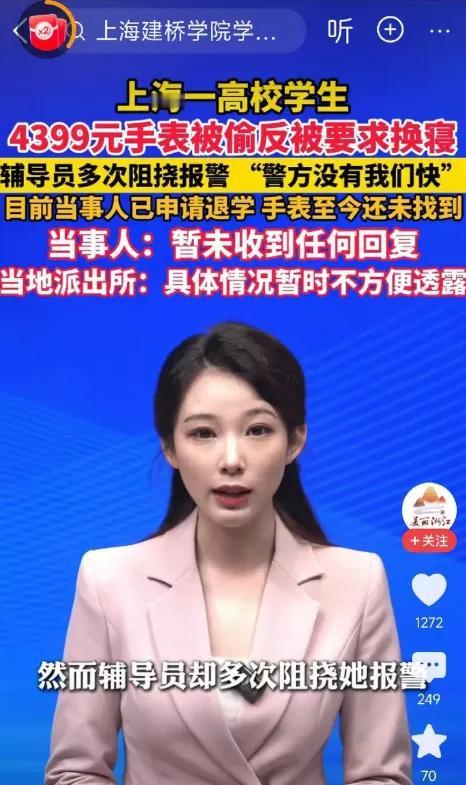 丢东西的退学,偷东西的留下!这种魔幻剧情竟在上海某高校真实上演。 大一女生小夏手表在宿舍被偷,定位直指室友向某。她本以为学校能主持公道,却等来辅导员连环骚操作。阻挠报警,威胁断电,甚至删家长手机证据。更恶心的是,向某本是惯犯,偷现金,化妆品连卫生巾都不放过,却被辅导员硬塞进新生宿舍。 受害者被迫退学,还倒贴学校5330元,小偷却安然听课。这小偷难道来路不小? 事件曝光后,校方装死,警方沉默。果然是乌烟瘴气的学校!学校遇事第一反应是压,不是查!今天压的是手表,明天压的可能是更恶劣的丑闻。 小夏的遭遇不是终点。如果我们默许这种解决提出问题的人的逻辑,下一个受害者会是谁?