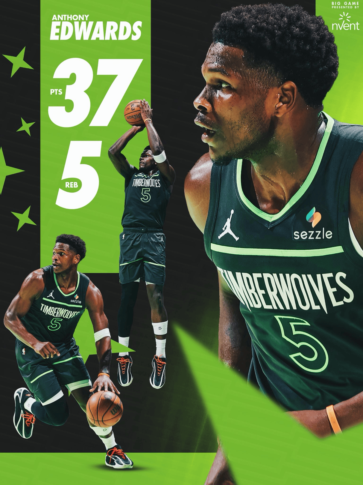 本场比赛,森林狼球员安东尼-爱德华兹出战26分钟,21投12中,其中三分球12投7中,罚球7投6中,得到37分5篮板1助攻1抢断1封盖。
