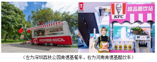 肯德基在深圳27座地标性公园设置超过30台公园餐车,开创全新消费场景,打造“一园一车一主题”模式;河南各大景区开设的肯德基酷饮车也成为游客休憩畅饮的绝佳去处。景区内的肯德基餐车不仅提供便利服务和优质美食,还成为城市夜生活的新地标。