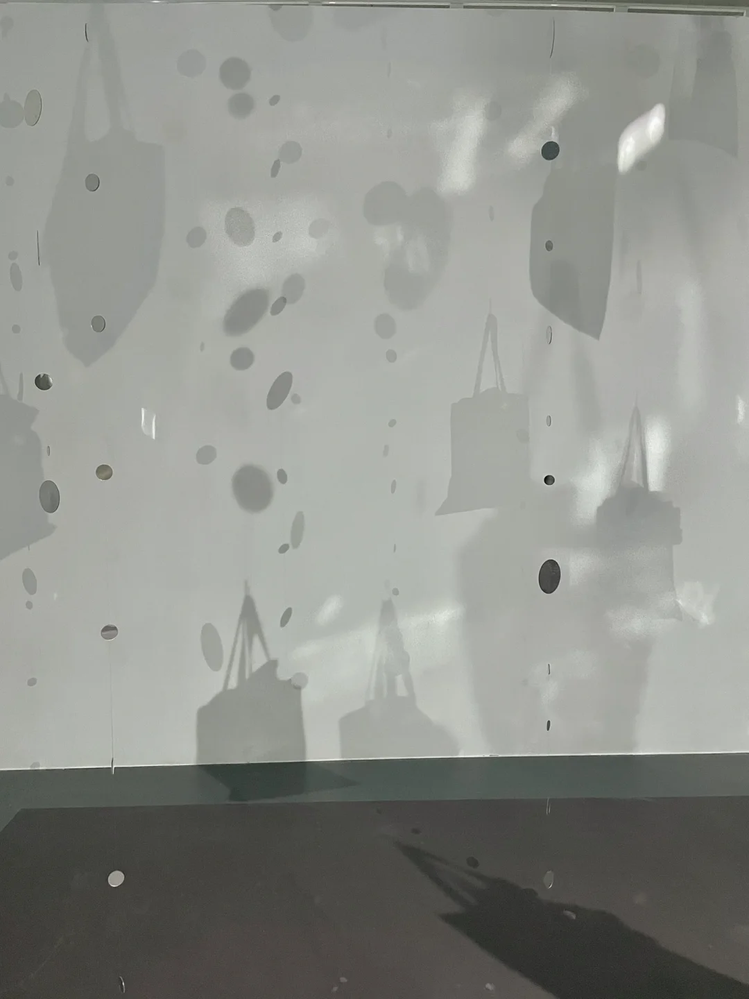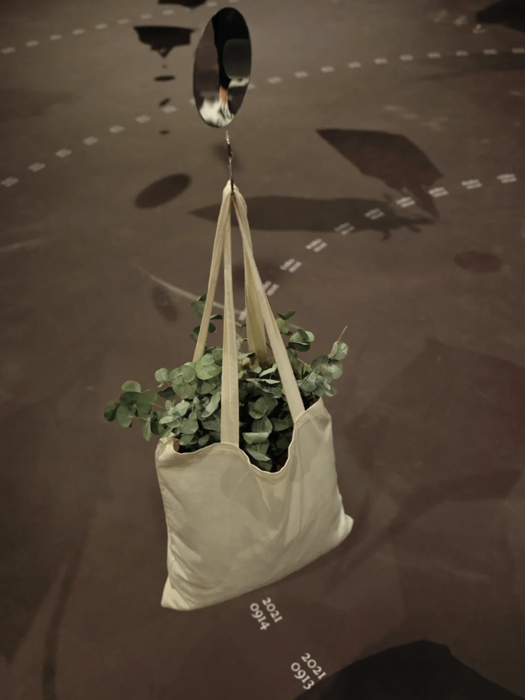装置叫“特别的一天”,这里悬挂了99个帆布袋,这是JUJUWANG从结婚十周年纪念日开始,将日期、天气、地点缝制在一个帆布包上,每一个帆布袋以周为单位。让我们可以仰望“星光”,重温过去的记忆。