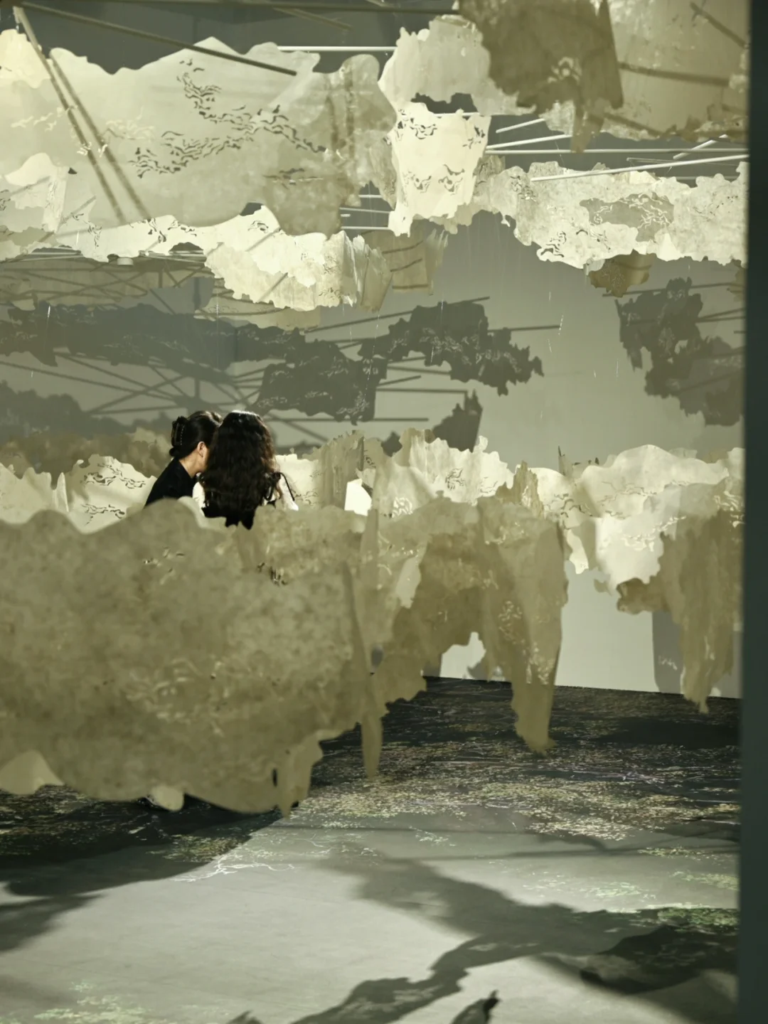 灵感来自于西双版纳的天空,里面可以进去拍照,可以游走在“云屋”之中,感受傣纸古老的工艺。