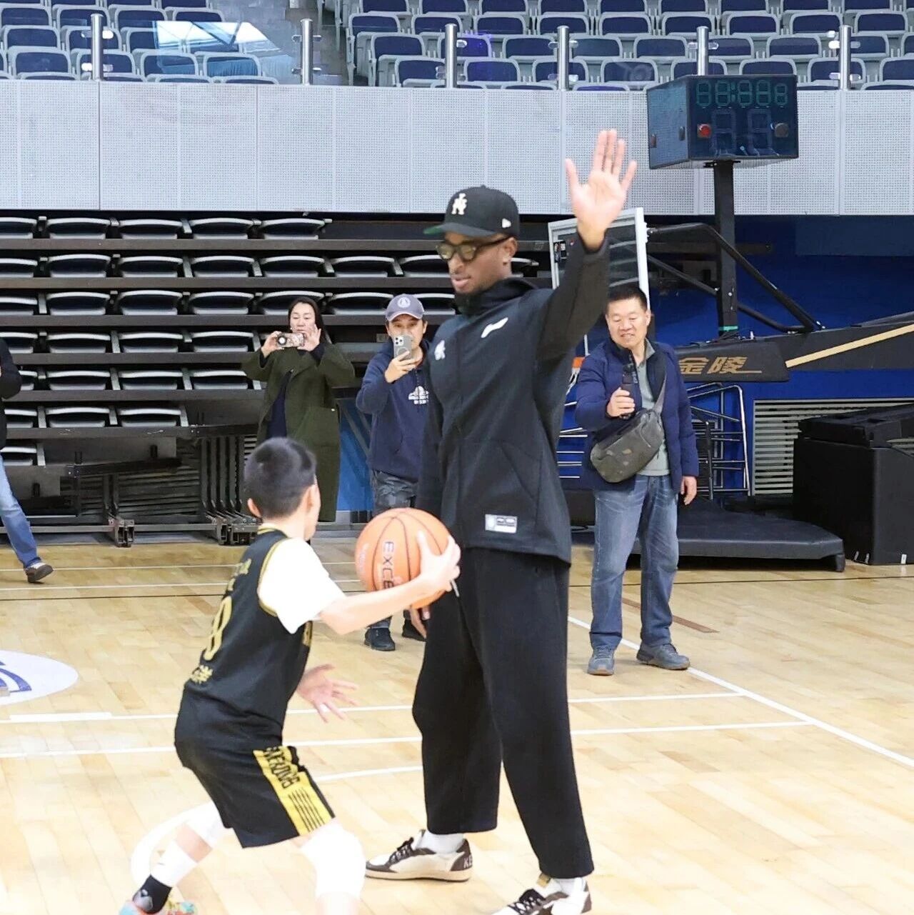 在随后的训练环节,两位训练师和助理教练将学员分为两组进行专业指导。外援纳托尔更是亲自上阵,为学员们示范标准动作,手把手纠正细节。训练尾声,纳托尔兴致大发,与学员们展开了一场精彩的三分球对决,将现场气氛推向高潮!短短一个半小时的公开课在欢声笑语中结束,学员们意犹未尽,外教和外援们也纷纷表示非常享受与孩子们互动的过程。”