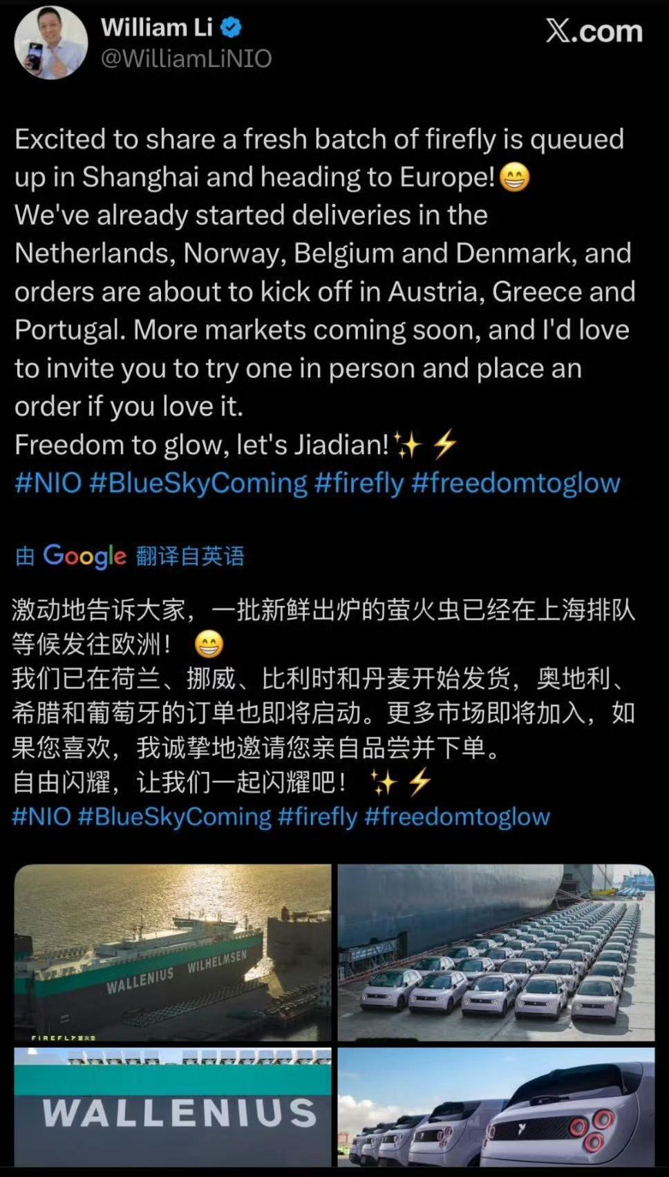 荷兰海牙的小伙伴跟我讲,他附近开了一家萤火虫门店。 昨天看到萤火虫上滚装船的消息