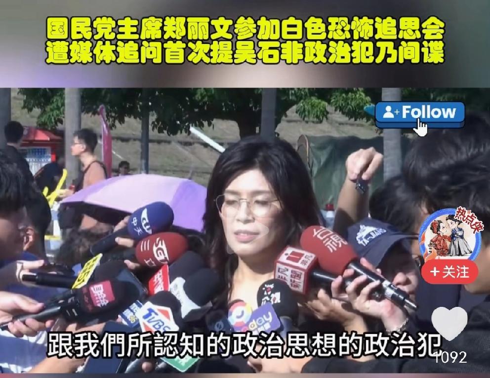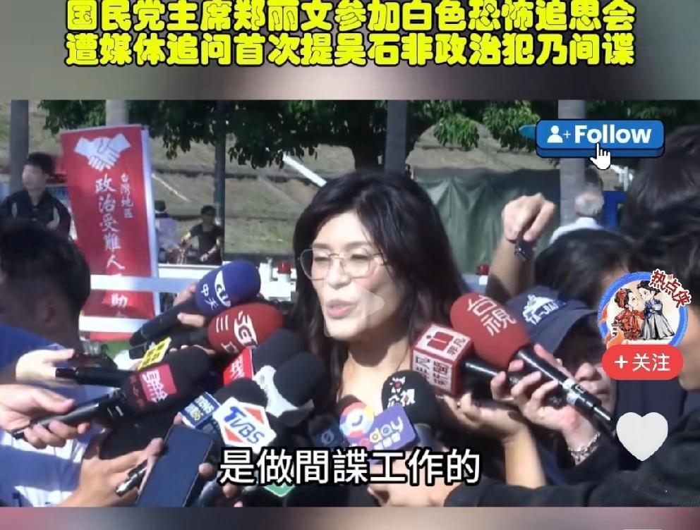 郑丽文参加秋祭,提到吴石,话里有话 郑丽文参加统派的秋祭活动,一番话耐人寻味: 我们讲的是为了自己的政治信仰和理念而牺牲的,或者是白色恐怖造成的冤案假案错案… 而吴石先生是怀有政治任务的情报工作者,是做间谍工作的,跟我们所认知的思想政治的政治犯,是有所不同的。 郑丽文,不愧是个国民党的政客。她主张两岸和解,促进和平,但是她的政治立场还是国民党的立场。 在她的心中,吴石烈士有别于其他冤死的政治犯。这一点认知和国民党当年对吴石将军的定性一样“共谍”! 不过,在两岸人民的心中,吴石将军就是为了台湾解放,祖国统一牺牲的烈士。 台湾当归,祖国统一,这是历史的潮流,因为我们都是中国人! 郑丽文这番话,话里有话,弦外之音,大家自己琢磨琢磨 台湾省郑丽文