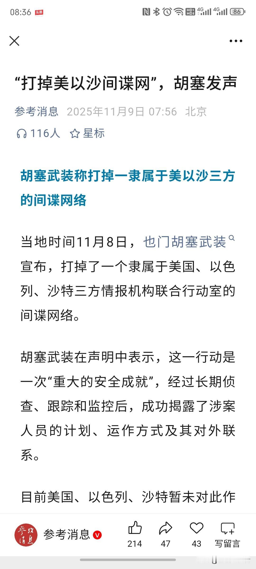 【美以沙三国间谍网被一锅端?胡塞武装这一刀捅破了天!】 胡塞武装这回搞了个大新闻!11月8日,他们突然宣布端掉一个号称由美国、以色列、沙特三方情报机构联手搞的间谍网络,直接掀了别人老底。说是“长期盯梢、一网打尽”,还得意洋洋称这是“重大安全成就”。可美以沙三家至今闷不吭声,是心虚还是懒得搭理? 要我说,这戏码比谍战片还刺激——胡塞武装平时被西方摁着头打,这回反手扣了个“三国谍报”的帽子,到底是真逮着大鱼,还是借题发挥搅混水?背后牵扯的中东乱局、也门内战、美沙关系,随便一根线头都能扯出满地瓜。尤其现在国际局势敏感,胡塞这一刀捅下去,沙特脸往哪搁?美国会不会暗地里报复?以色列又打算怎么接招? 普通人看热闹,内行看门道。间谍战从来是真假难辨,但胡塞选这节骨眼发难,摆明是想搅乱对手阵脚。若消息坐实,中东这盘棋怕是得更乱;若是虚张声势,胡塞下一步会不会有更狠的招?评论区聊聊——你觉得这回是“实锤”还是“演戏”?