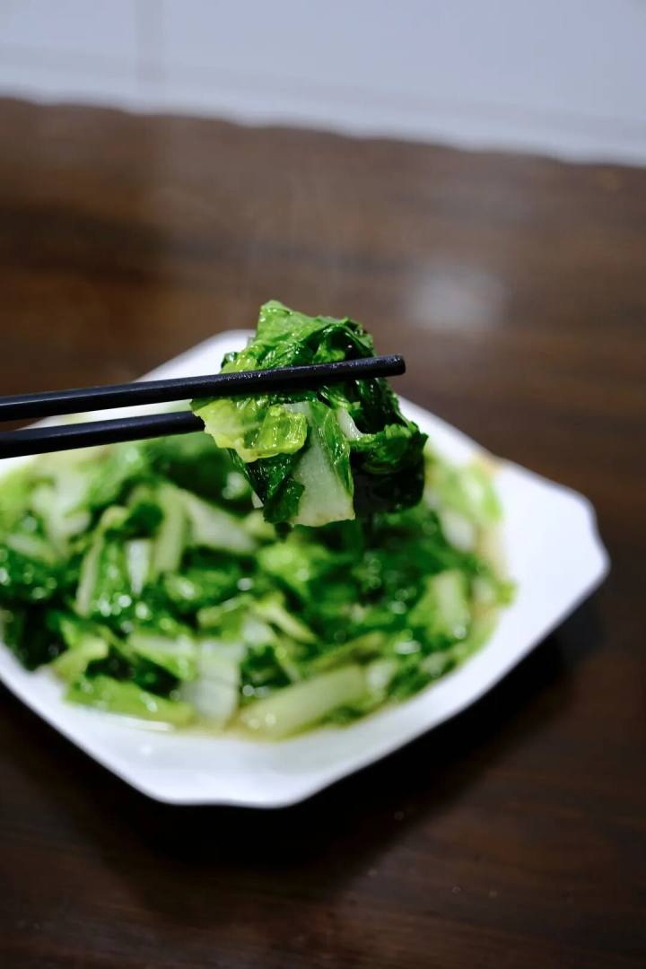 炒毛毛菜,交代二代目老板娘,勿放蒜泥。