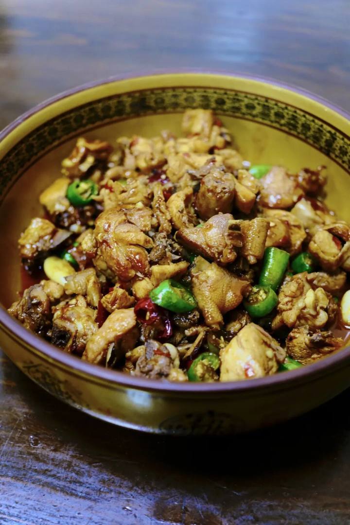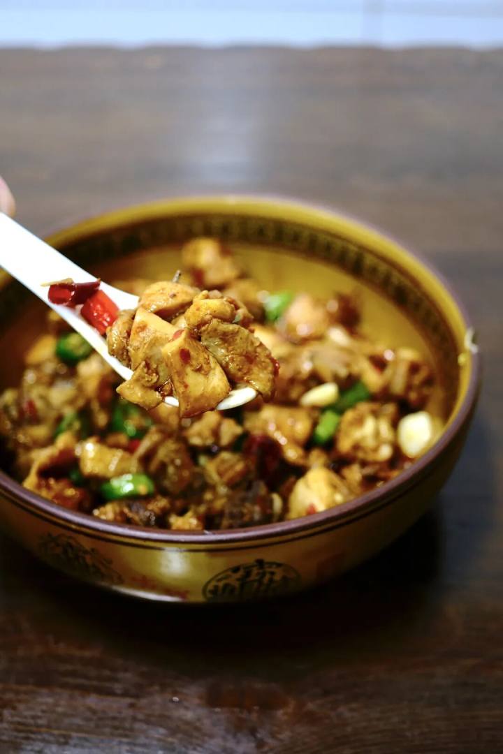 江山人,江山鸡,手起刀落,斩剁一碎,鸡块斩将上来,大的大,细的细,毫不拗造,情放志荡。鸡块并以杭椒、干红椒、小米辣急火快攻,热情上桌,香嫩杀饭。