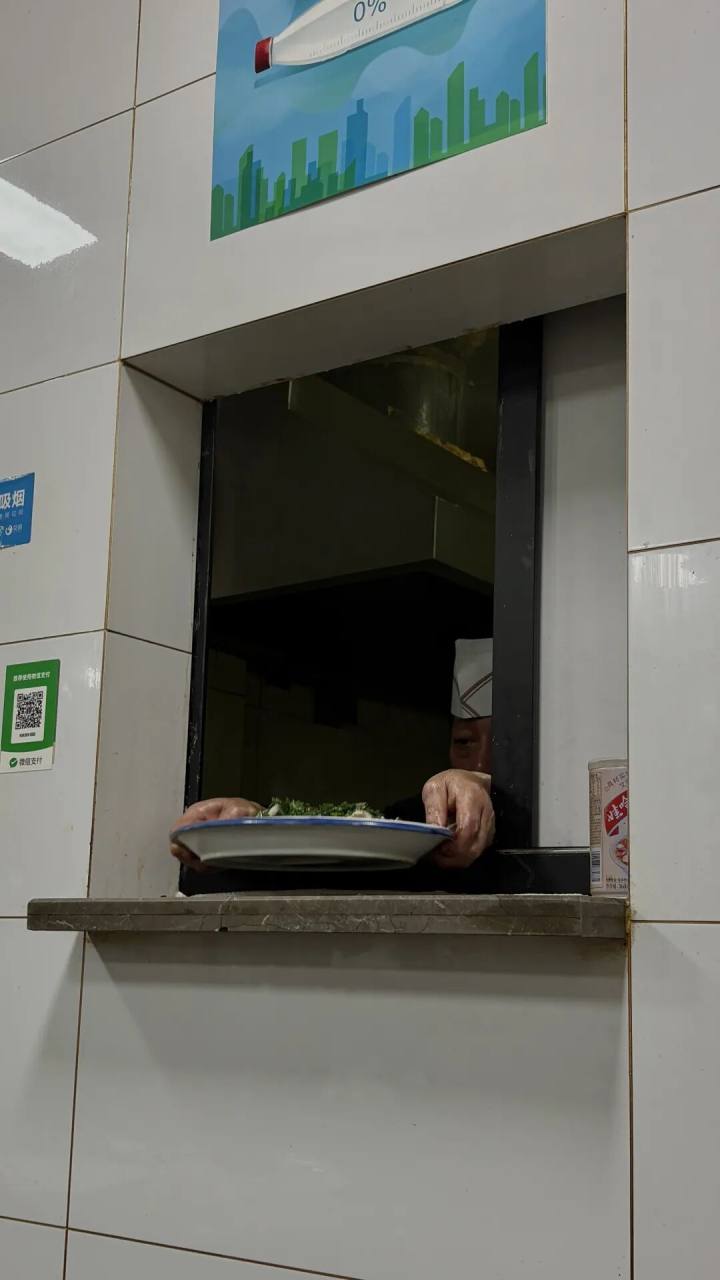 上菜特逗,后厨每炒好一道菜,老板娘舅舅就从里头拉开传菜口小窗,手一伸,菜搁在窗口,迅速把窗拉上,偶尔探出半颗脑袋,瞅一眼外头情况,旋即又缩回去。
