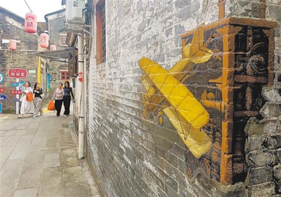 记者在启明楼旁的一面青砖白墙上,看到了陈海豪绘制的题为“侨村风华焕新时光”的大型画作。画面中,启明里的标志性侨屋——启明楼与现代化的高楼建筑相互辉映、交融共生,点缀其间东艺宫灯,隐喻着历史与未来的对话与传承。另一幅作品《飞机》,则让中国航空之父冯如设计的飞机从旧墙中呼啸而出,致敬蓬江工业的创新与探索精神。