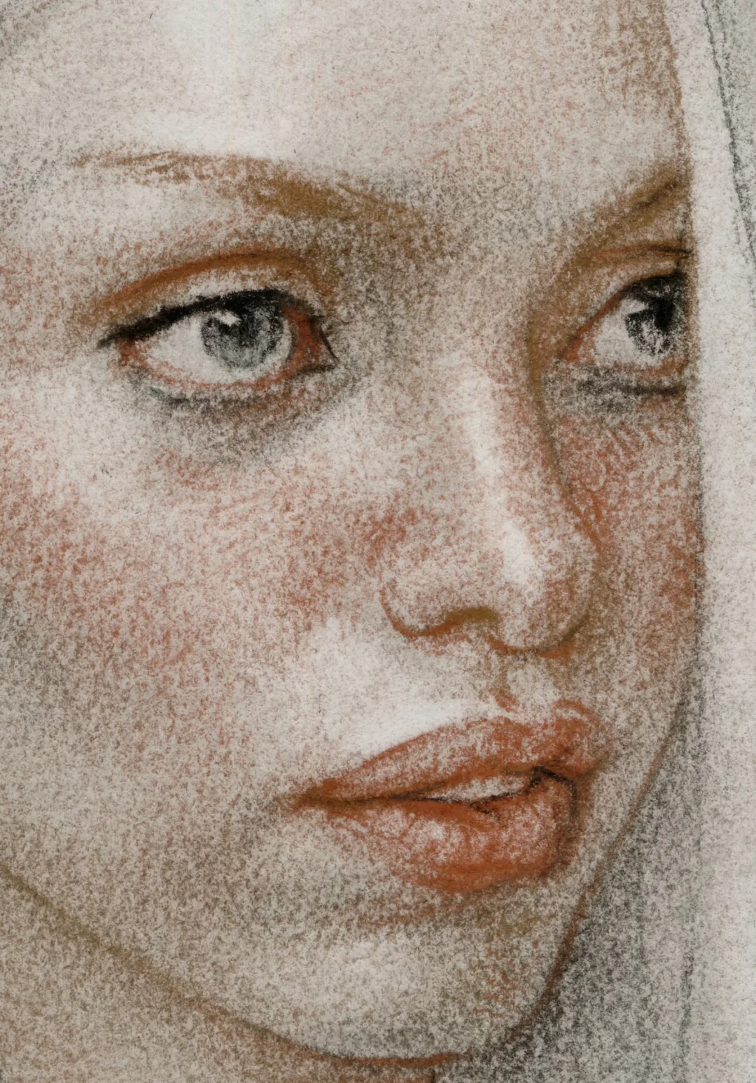 “三支笔素描”画明亮的白色调,主要用橡皮当油画里的白颜料使用。索斯制作的浅灰底色,与三个颜色配合能够产生灰纯和冷暖的丰富色彩层次。其实与画一张油画的色彩思路几乎没有区别。 棕、土红、黑德国施笔乐(天鹅)粉彩笔 法国阿诗丽芙BFK纯棉手工版画纸 索斯自制有色底 橡皮提白 38X28CM(八开)