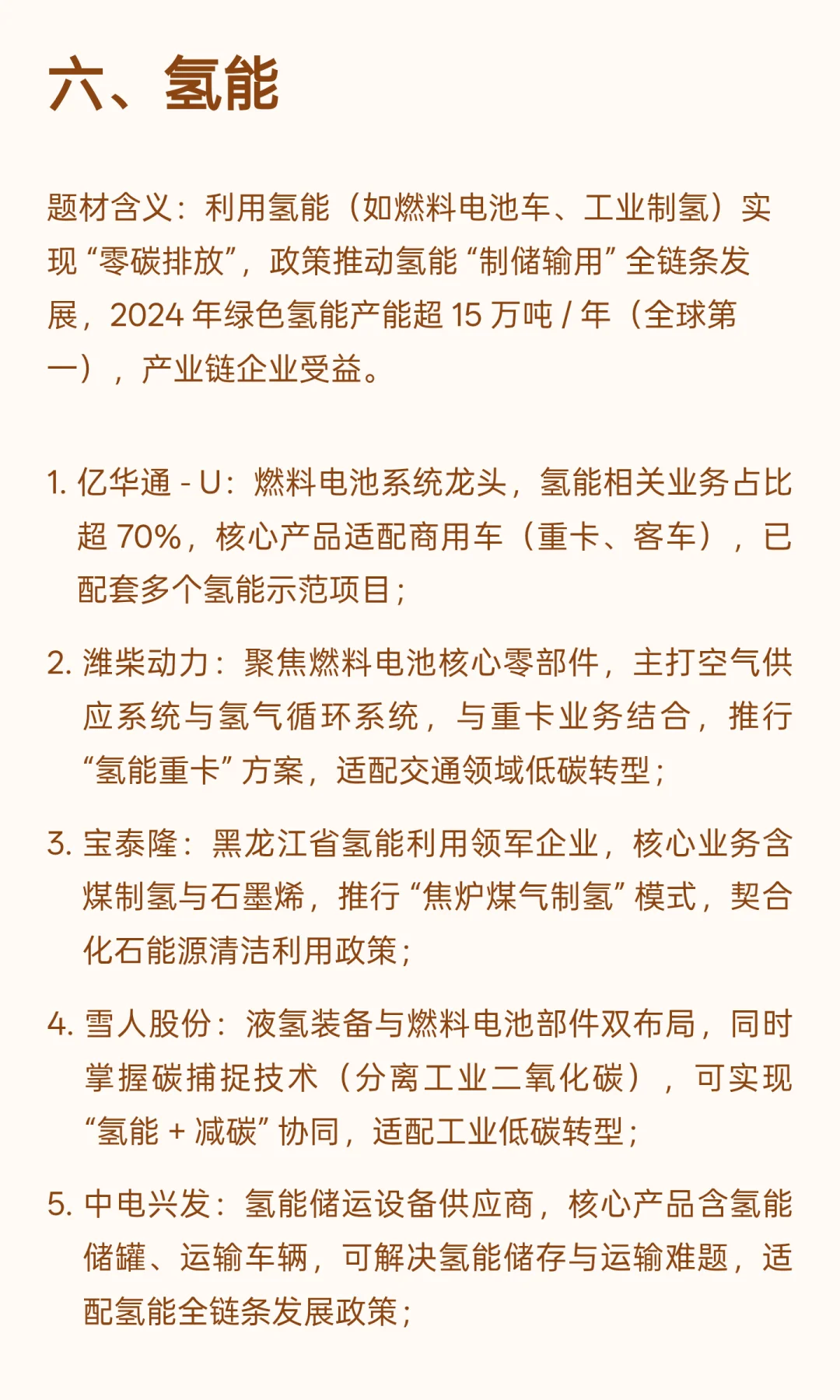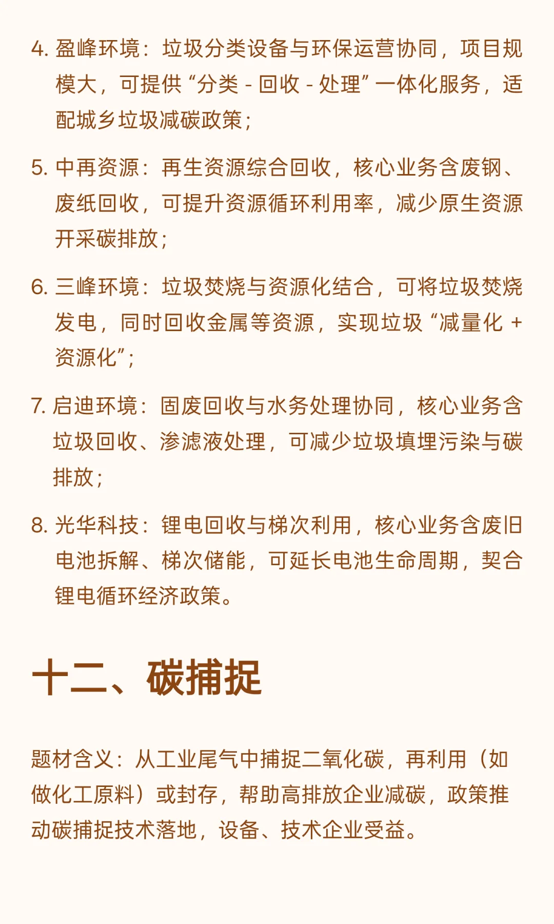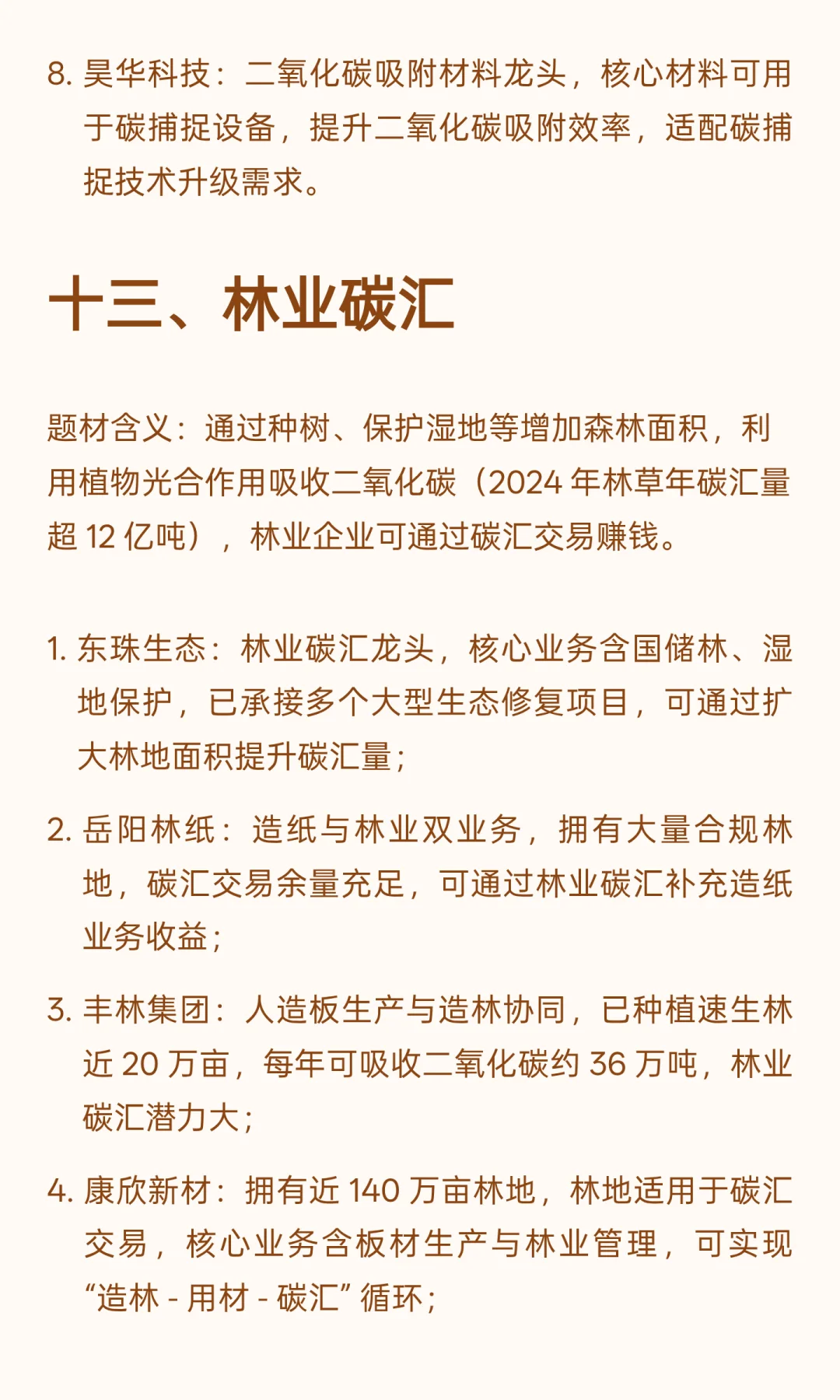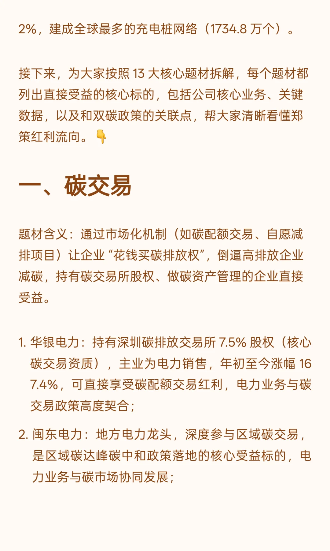 接下来,为大家按照 13 大核心题材拆解,每个题材都列出直接受益的核心标的,包括公司核心业务、关键数据,以及和双碳政策的关联点,帮大家清晰看懂郑策红利流向。