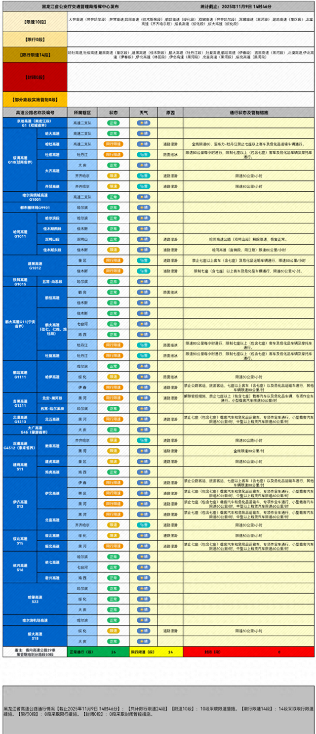 受天气影响,之前,黑龙江省内多条高速公路采取封闭、限速限行等临时交通管控措施。9日15时许,记者从黑龙江省公安厅交通管理总队高速交管部门获悉,截至目前,因雪封闭的43段高速公路已全解封,但仍有哈牡高速等24段高速公路限速或限行,限速为80公里/小时。