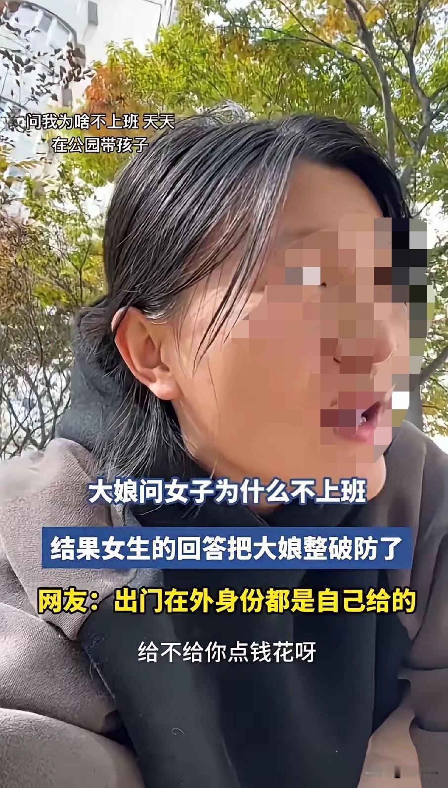 山东有个姐们儿,天天带着娃在公园晃悠。有回碰到个大娘,上来就问:“你咋不上班啊?” 这哪是关心啊,明摆着就是来看笑话、挑茬儿的!谁料这姐们儿情商高,一句话就给大娘怼得没话说,直接破防了。 她笑着说:“大娘,我炒股票的呀,您还不知道?我一个月差不多能挣8万,每个月都给我公婆5万让他们随便花,他俩现在啥心都不用操。对了大娘,您儿子和儿媳妇,平时给您钱花不?” 其实明眼人一看就知道,她这话是编的。可你别说,这么一怼,是真解气!大娘当场就哑口无言了。 谁不想上班啊?谁乐意天天在家带娃、围着孩子转?道理大家都懂,可架不住总有些人大嘴碎,管得宽,就像这个大娘。 你要是实话说“得在家带娃,没法上班”,她能就此打住吗?根本不能!那才是刚开始,接下来她就得显摆:“我儿媳妇多厉害,又上班又能挣钱”,没完没了。 所以啊,对付这种闲言碎语,就得这样,自己给自己立个“不好惹”的身份,直接把别人的嘴堵上,让她没话可说。出门在外,有时候身份还真得自己给!