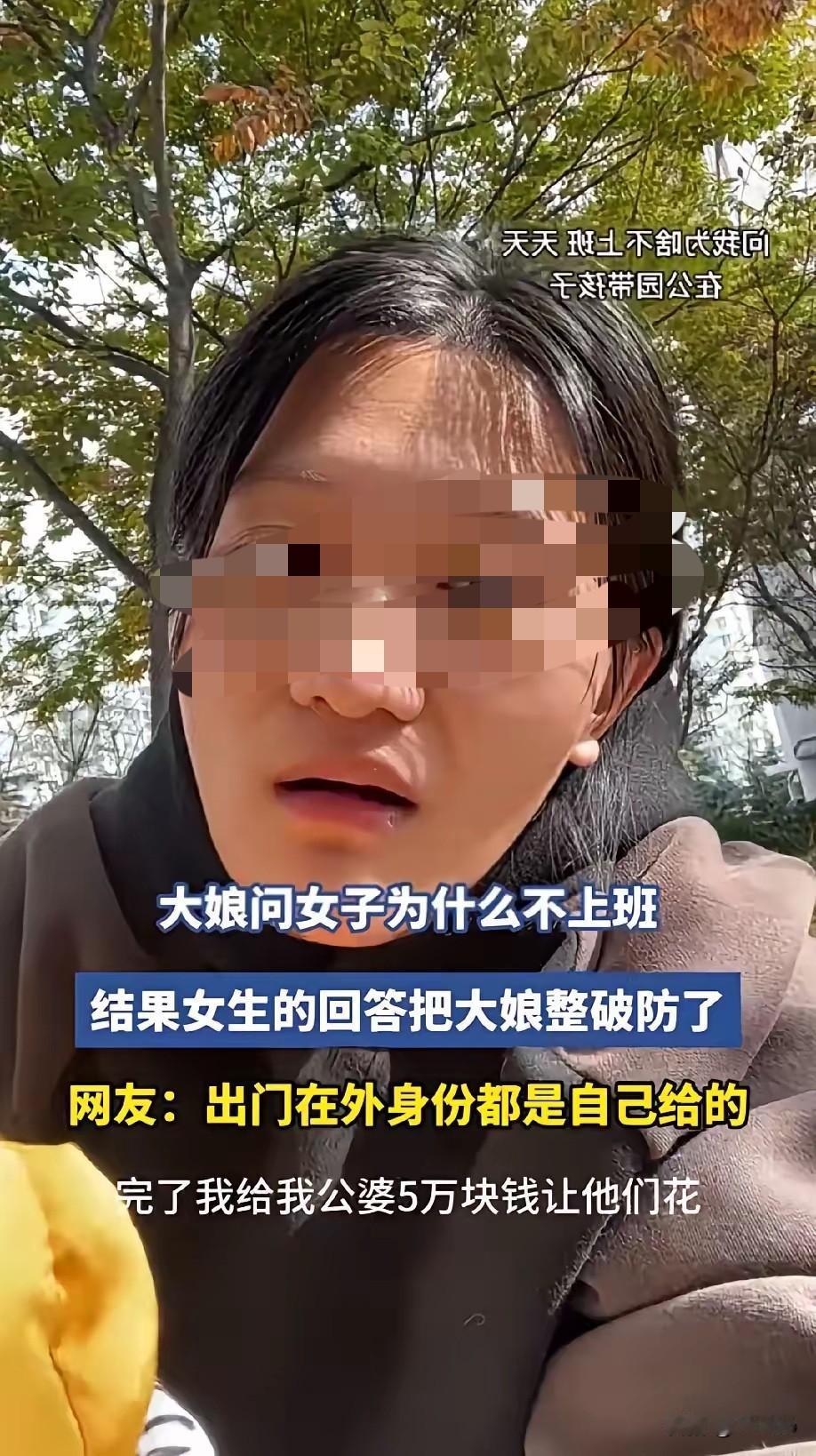 山东有个姐们儿,天天带着娃在公园晃悠。有回碰到个大娘,上来就问:“你咋不上班啊?