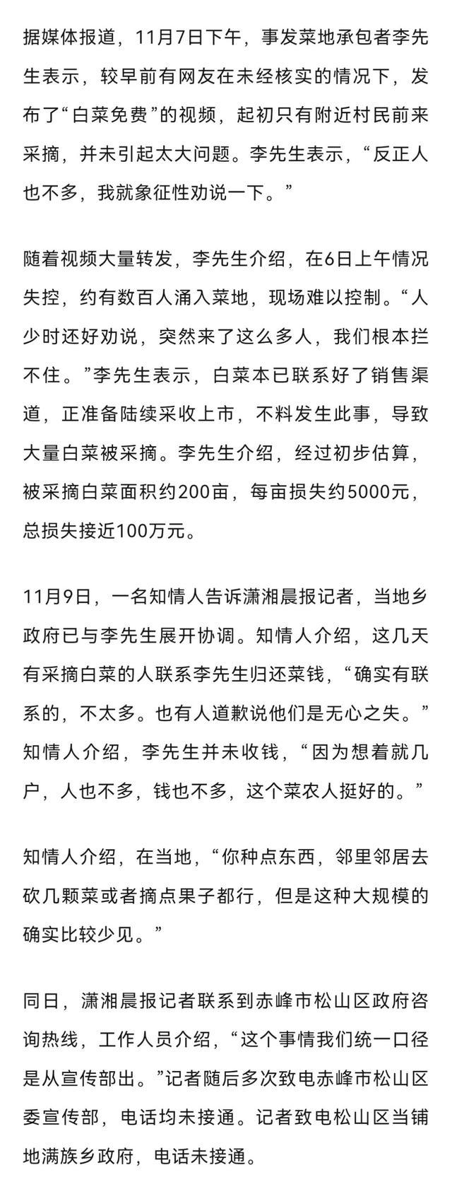 近日,一条“白菜免费”的视频在网络上广泛传播,导致内蒙古赤峰一菜地承包者近200亩白菜被闻讯而来的人群采摘,损失严重,引发关注。据媒体报道,现场有人携带麻袋,骑着电动车或开车来到菜地采摘白菜。