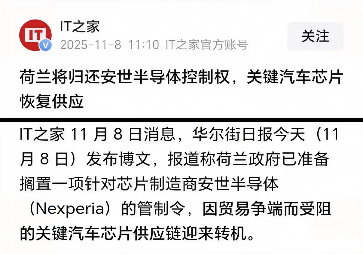 荷兰将归还中国安世半导体控制权:技术霸权的低头与市场的胜利 "扣芯片一时爽,车企闹翻肠"。荷兰政府折腾一个月后终于认怂,把安世半导体的控制权乖乖还了回来。这事儿就像开餐馆的老板突然把厨子关小黑屋,结果发现全街饭店都得歇业,最后只能灰溜溜把人放出来。 政治算盘打不响的尴尬 当初荷兰政府拍脑袋扣芯片时,肯定没料到会捅这么大娄子。全球汽车厂就像被掐住脖子的鸭子,大众、本田这些大厂直接跳脚——没有安世那些不起眼的小芯片,高级电动车立马变废铁。荷兰人这才发现,所谓"技术封锁"根本是七伤拳,打别人先把自己震出内伤。 最讽刺的是,被扣的安世半导体前身是荷兰飞利浦的亲儿子。这出"爸爸关儿子"的戏码,活脱脱展现了西方技术霸权的精分现场:一边喊着防中国,一边自己先断气。 车企们的"备胎突击战" 这一个月里全球供应链上演了教科书级的自救大戏。法雷奥这些零部件商像饿狼找食,三天就扒拉出替代方案;中国东莞工厂连夜增产,把芯片当包子蒸;日本车企嘴上说"只认日货",背地里偷偷试用中国芯。市场这双无形的手,比政府红头文件好使多了。 有个细节特别打脸:某德国车企大佬私下说,"再闹下去我们就要用中国方案了"。这话吓得荷兰政府连夜开会,毕竟真把客户逼到对手怀里,那可真是赔了夫人又折兵。 芯片战争的启示录 荷兰这次认栽给全世界上了生动一课:在真正全球化时代搞技术霸权,就像在自家客厅拉电网,最先电着的准是自己人。现在连ASML都站出来说"不能断供中国",资本家们的算盘打得门清——钱可比政治口号实在多了。 说到底,安世事件就像个照妖镜,照出了三个真相:第一,中国制造早就不是随意拿捏的软柿子;第二,全球供应链是条咬尾蛇,谁乱动都会被反噬;第三,市场终究比政治家的嘴硬。这场闹剧最后以荷兰服软收场,恰恰证明在真金白银面前,再硬的霸权也得低头。