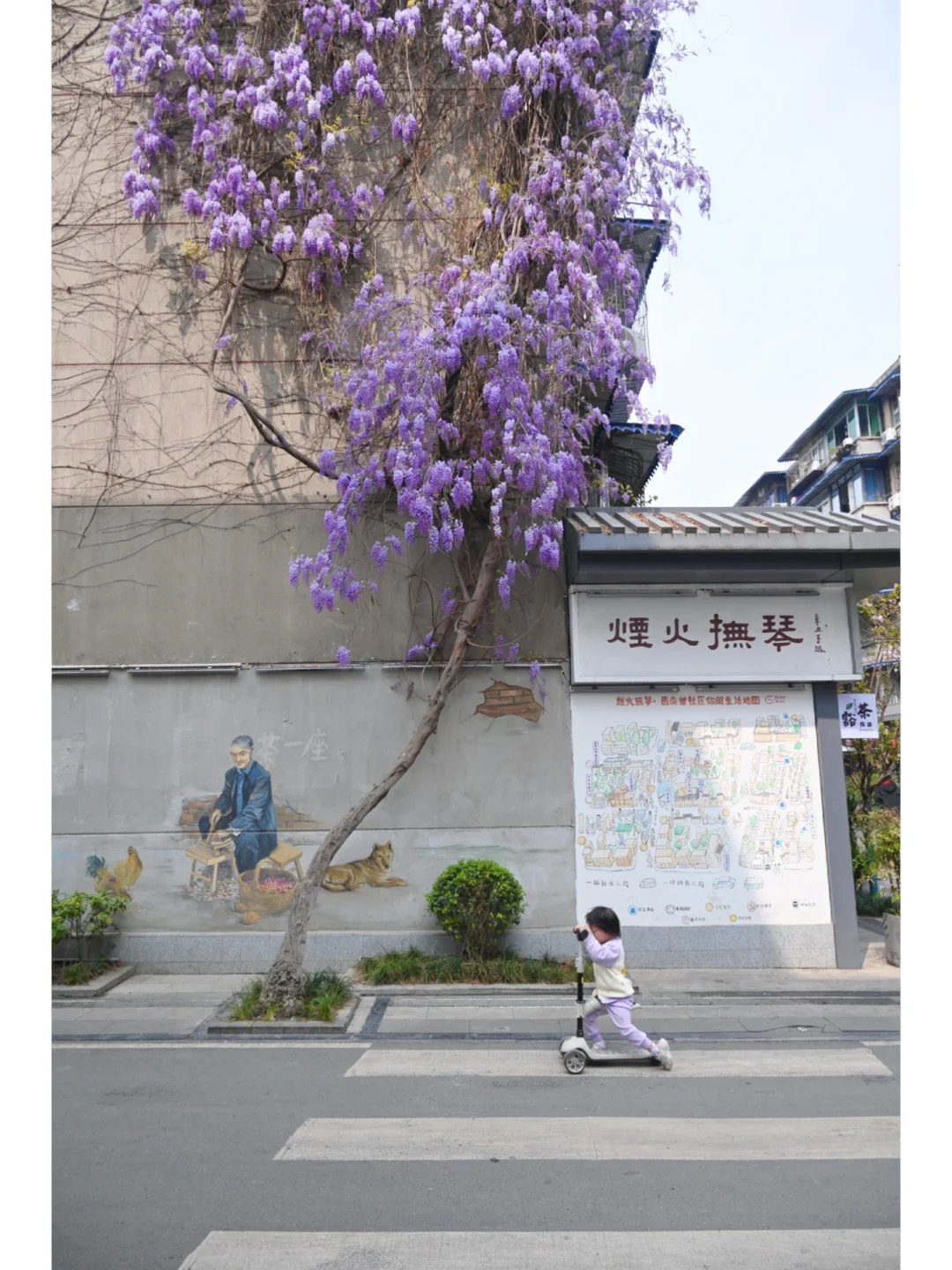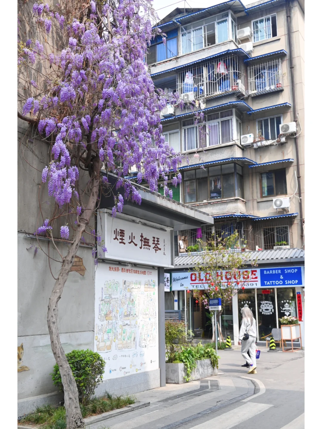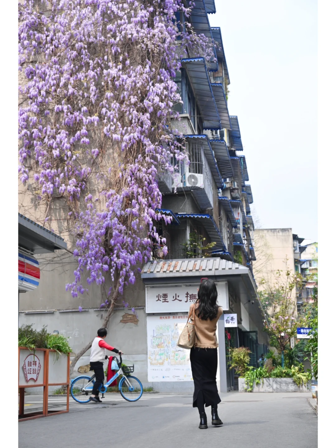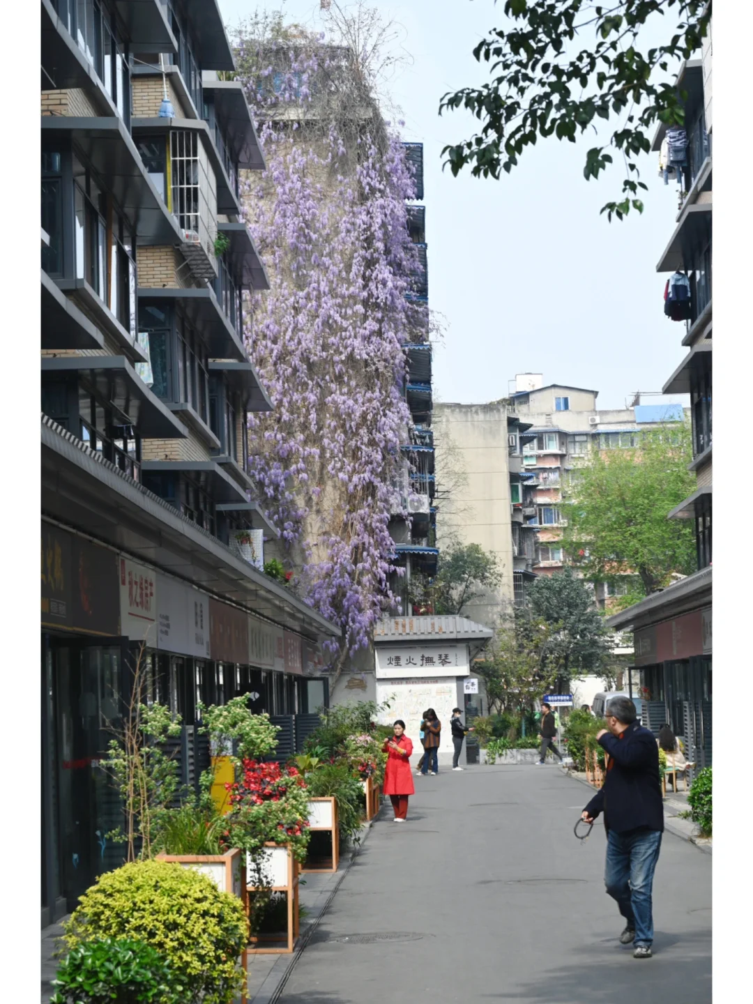 看到此景想起初中语文课本中宗璞先生写的《紫藤萝瀑布》。 花和人都会遇到各种各样的不幸,但是生命的长河是无止境的。 这株藤萝在烟火市巷里,几十年攀附着老房,冬去春来,傲然怒放,春天从未停止生长。 🌸花期:预计半个月左右,目前花还没完全开完,花枝末端还有些许花瓣未开,预计周末迎来最佳观赏期,📸照片3月21日实拍 📍地址:成都地铁5号线抚琴站A口出来往前走几步,往左就能看到了,导航“豁茶点酒”即可。