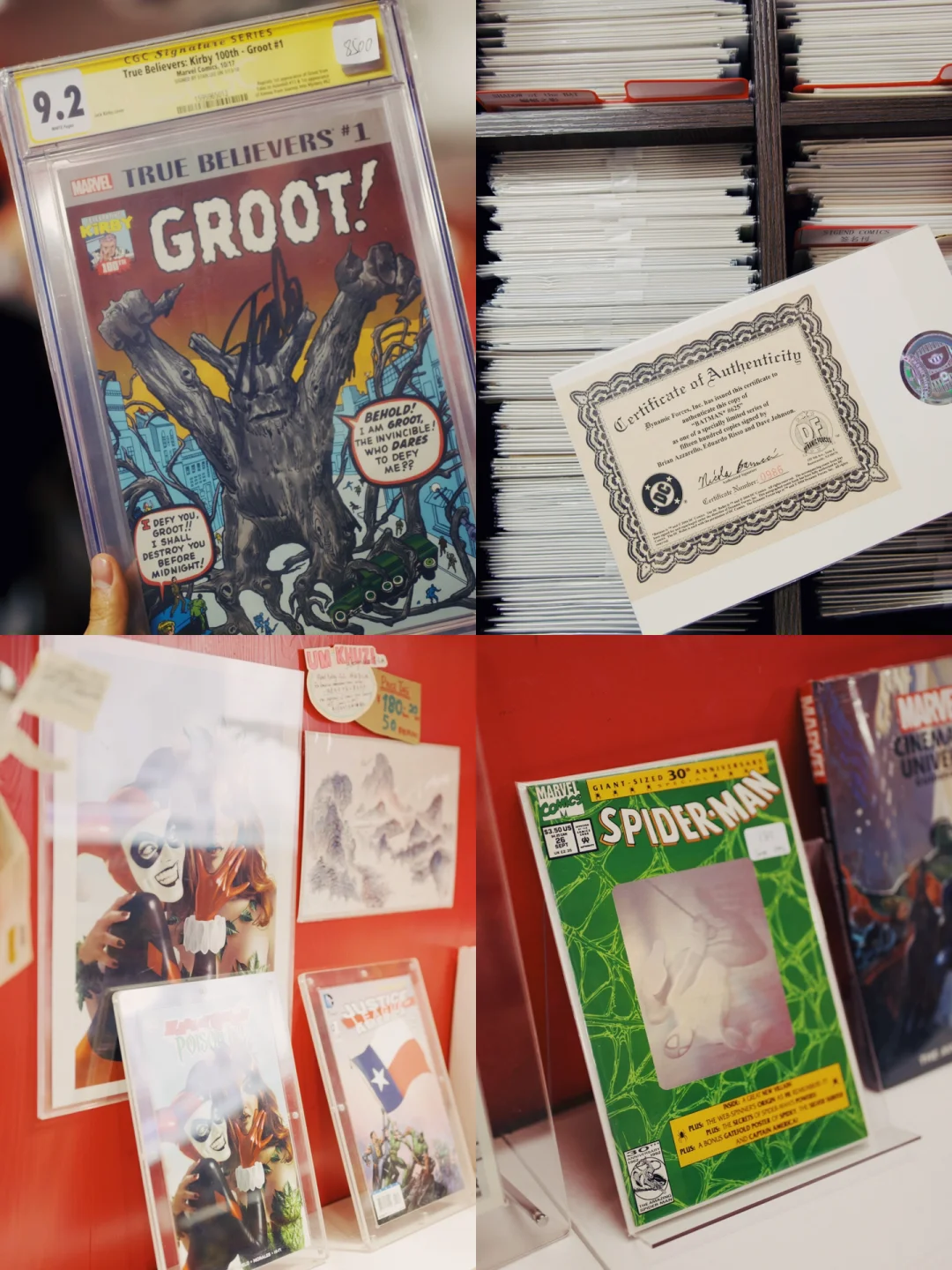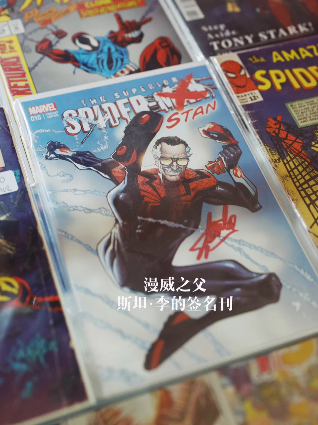店里还有一个柜子装的是有价值或者是珍藏意义的期刊,这些有很老的期刊、稀有变体漫、著名人物第一次登场的期刊、还有就是签名刊,其中就有漫威之父斯坦·李的签名刊✍️。旁边的电视下面也有CGC评级的漫画,黄色的有签名,蓝色的则没有。