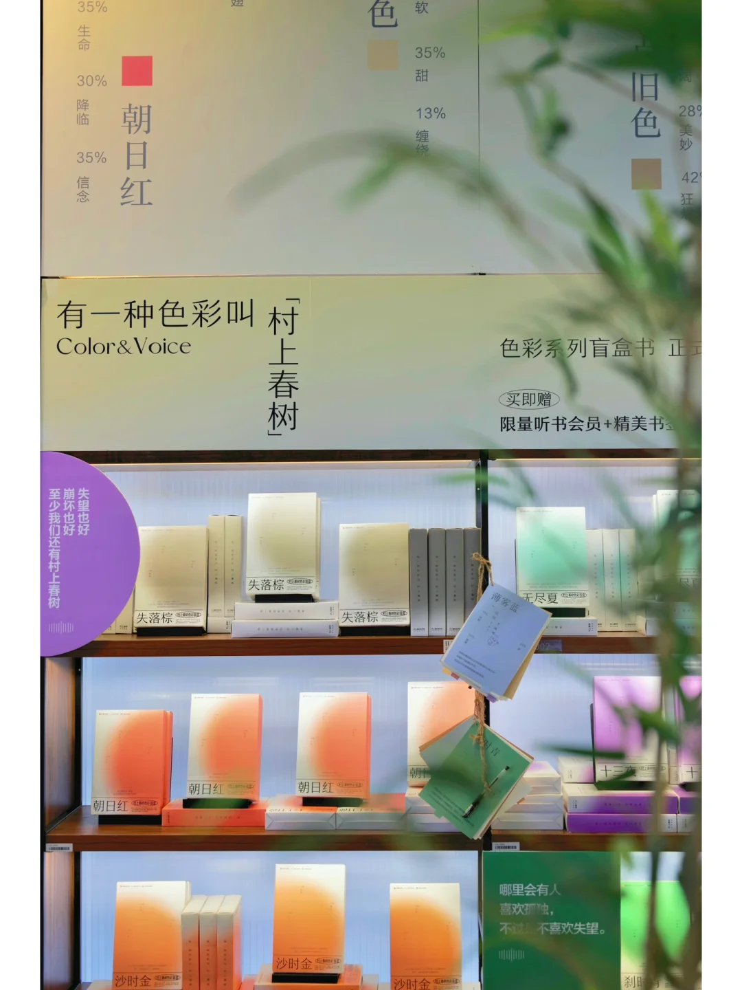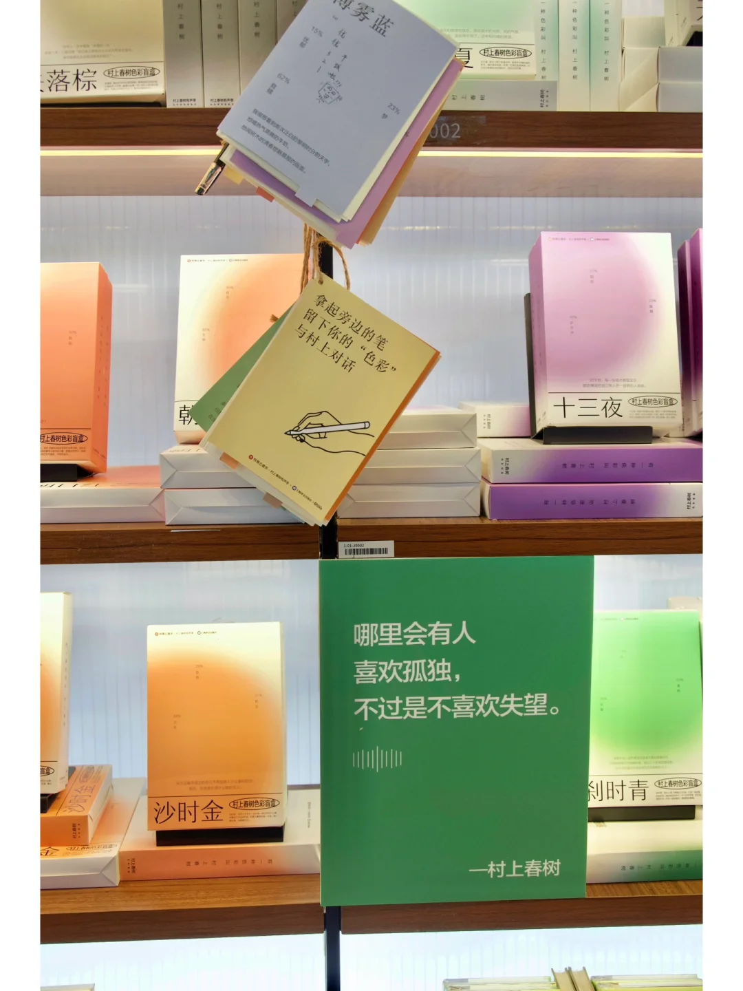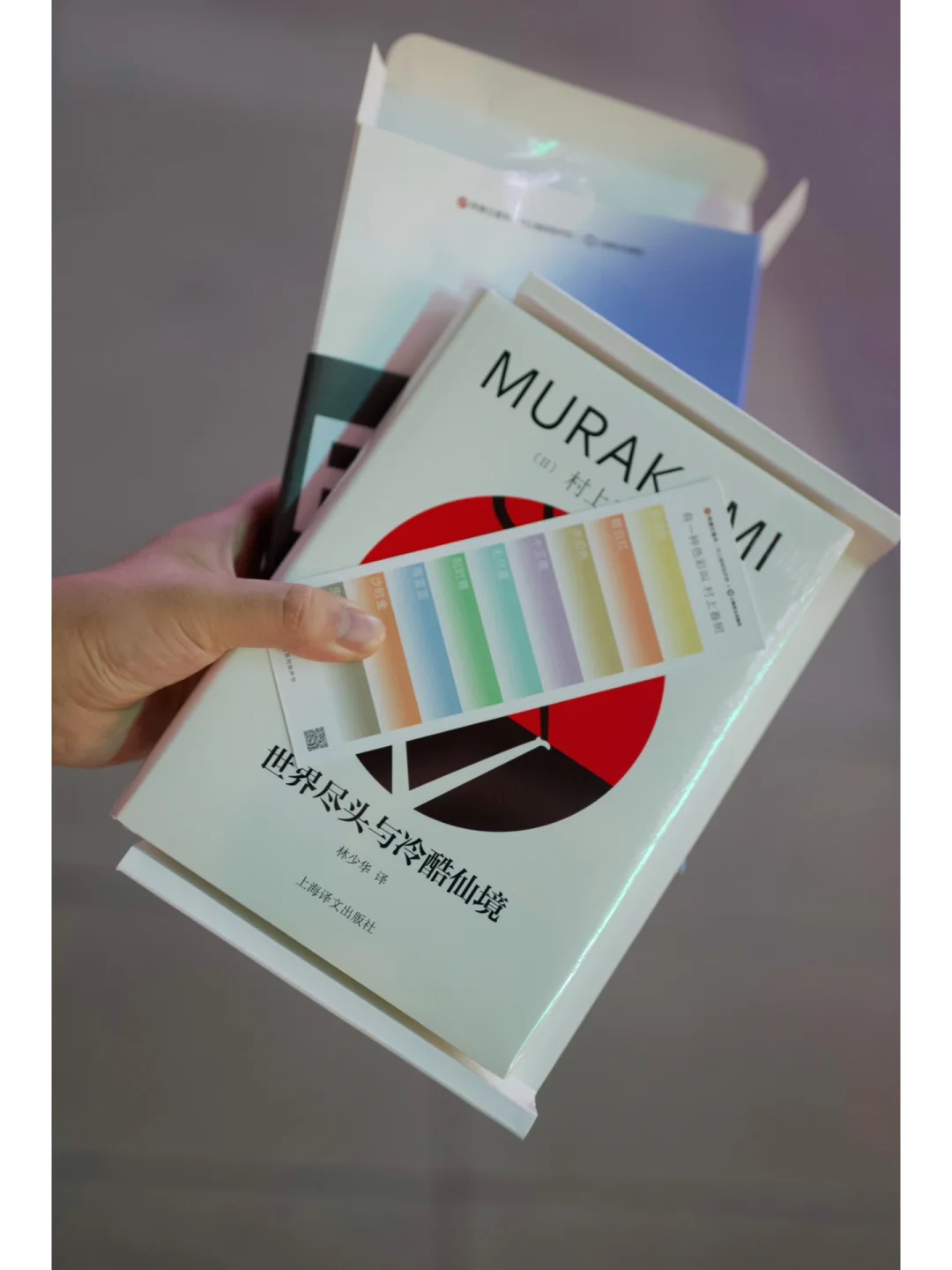 在找讲演厅的时候,意外发现发现书店还有村上春树🗻的盲盒书架,整列的书架都是村上春树的书,但是都是盲盒,盲盒有无尽夏、失落棕、刹时青、薄雾蓝、黄油色、朝日红等9个颜色,绘制成一整面多巴胺墙,每个色系之间的配合都恰到好处,无疑是今天书店里的一抹盎然。朋友选择了薄雾蓝🔵,这个颜色她最喜欢,跟我说摇了一下有点重,应该是本好书,结果竟然是《世界尽头与冷酷仙境》,村上春树的三大杰作之一,刚好这本书朋友没有。
