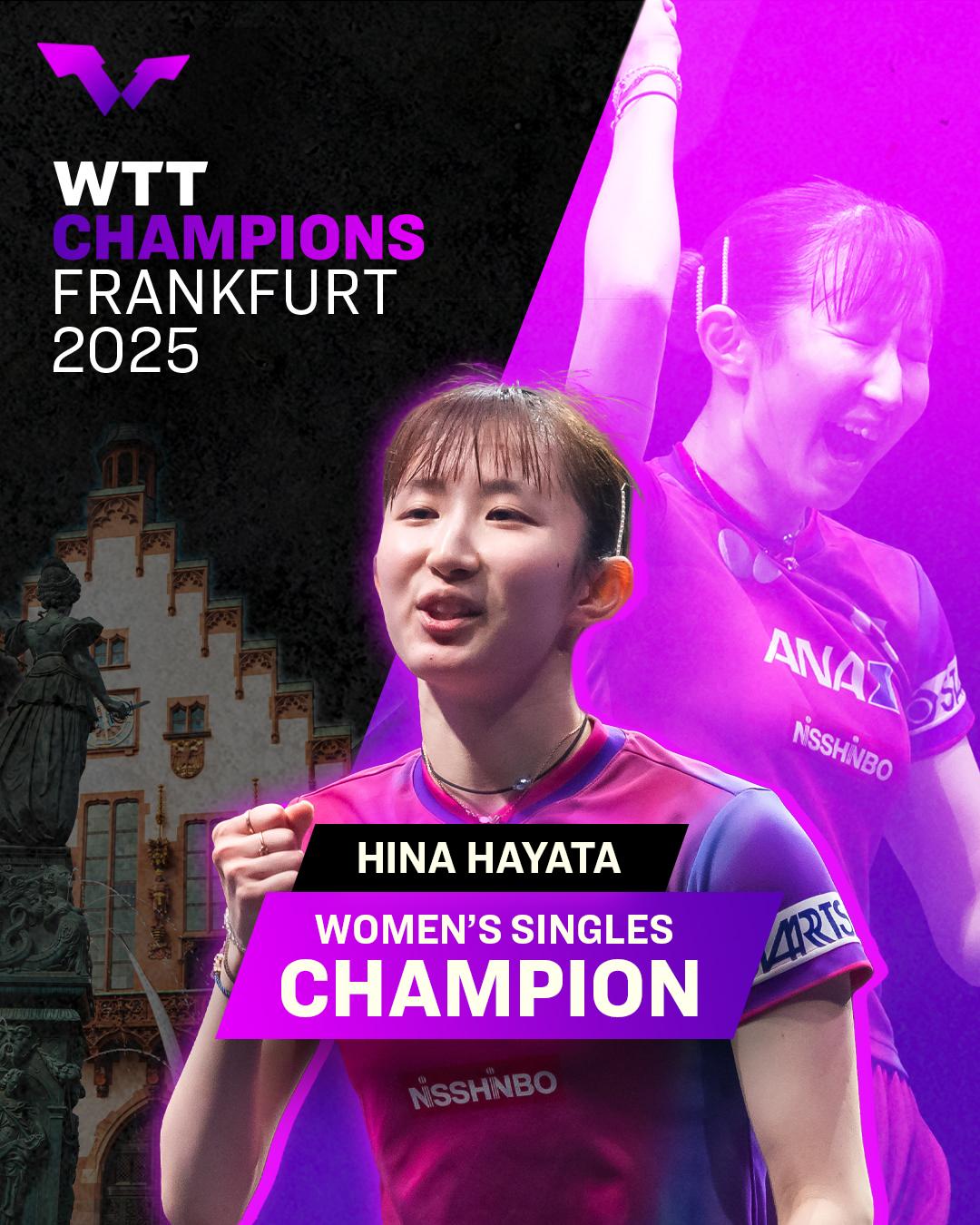 WTTins报道。在WTT法兰克福站女单决赛中,日本乒乓球队选手早田希娜首次夺得该项赛事女单冠军,成为WTT法兰克福站新科女单冠军。