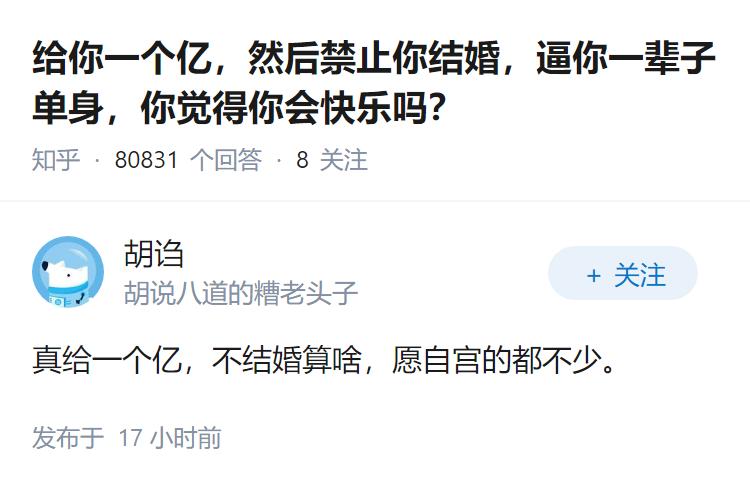 给你一个亿,然后禁止你结婚,逼你一辈子单身,你觉得你会快乐吗?