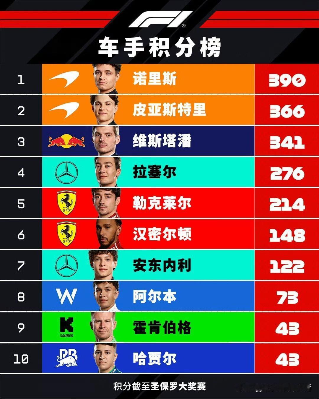 2025F1巴西赛后车手和车队积分榜:图一:车手积分榜,诺里斯连追六站,从落后
