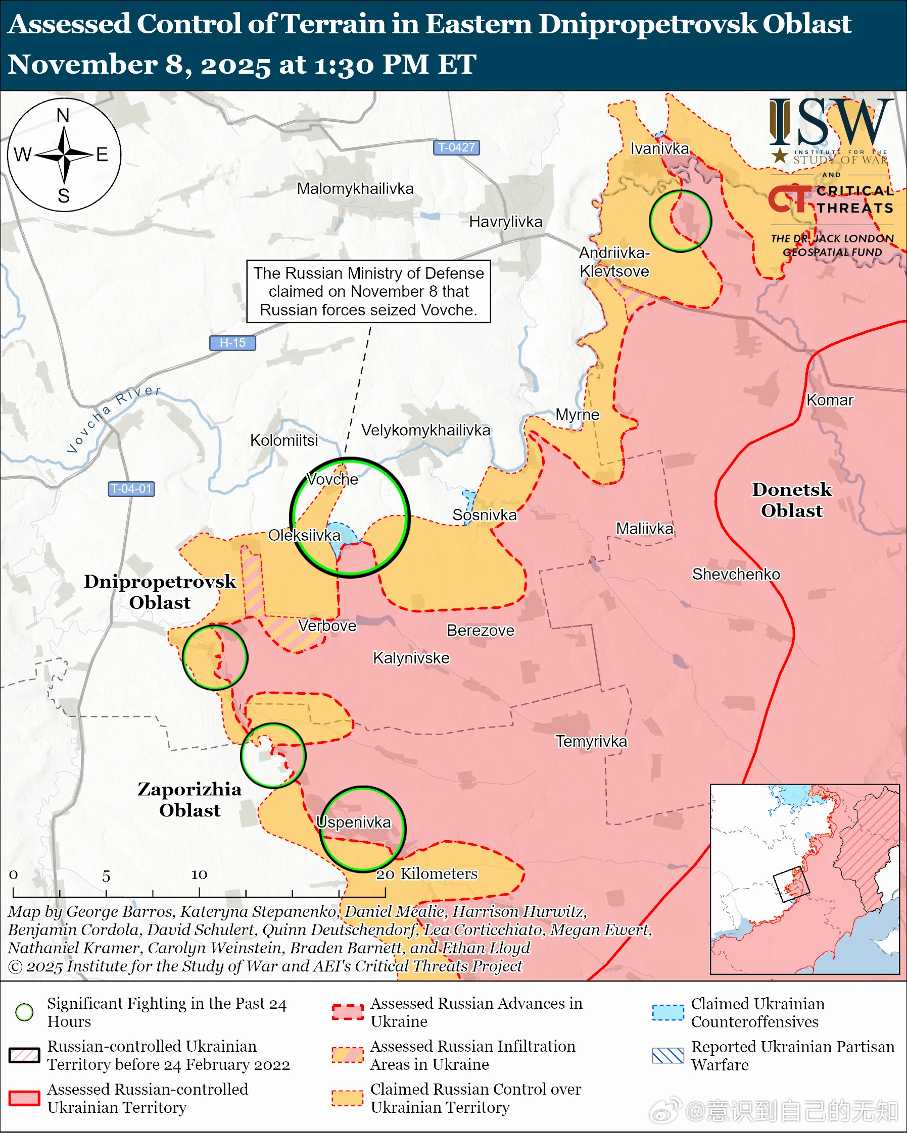 11月7日和8日,俄军在韦利科米哈伊利夫卡以东的西奇涅韦附近、韦利科米哈伊利夫卡以南的韦尔博韦附近以及奥列斯托皮尔方向、以及韦利科米哈伊利夫卡西南部的普里维利亚和叶戈里夫卡附近发动进攻。乌克兰总参谋部报告称,11月7日和8日俄军在捷尔努瓦特方向发动了战斗,可能指的是扎波罗热州的捷尔努瓦特(位于韦利科米哈伊利夫卡西南,距当前接触线约12公里)。(ISW)尚未发现证据表明俄军已推进到当前前线后方如此远的距离。