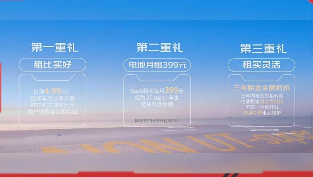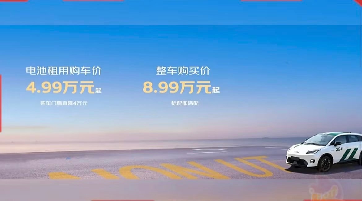 租电4.99万,整车8.99万,明年交付补贴购置税,月租399,3年内由租转买,租金抵尾款。租电京东补贴2000,整车补贴4000。我们算笔账:电池一年租金4800,保险算4000,一年9000左右,开十年90000+49900=139900,均摊一年14000,一个月1166的用车费用,租个车开也不止1000一个月,划算啊。