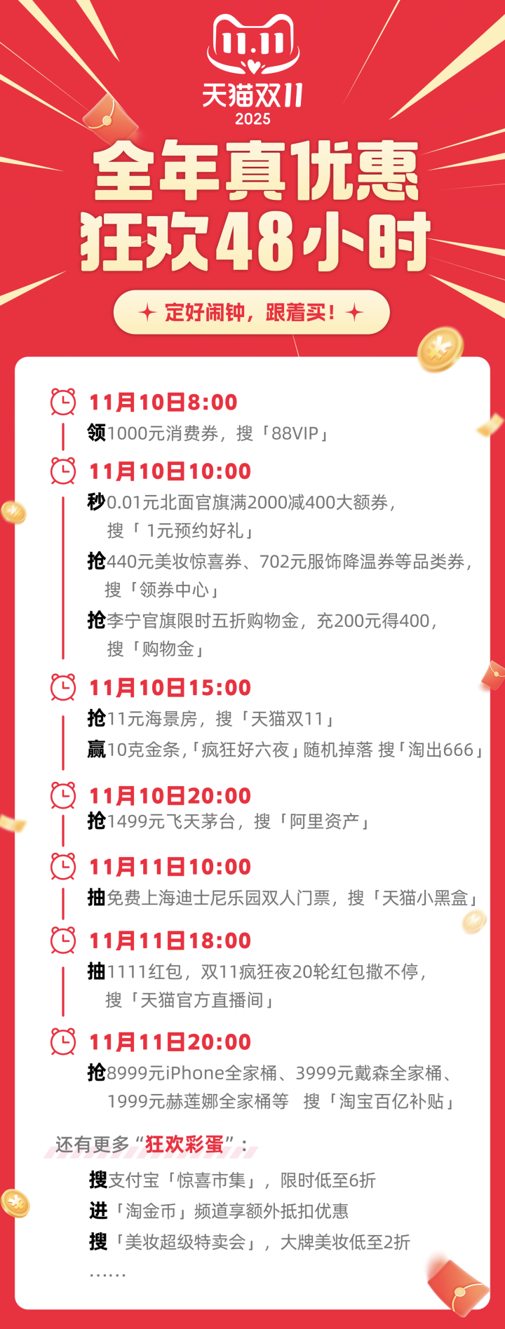 狂欢48小时,定好的每个闹钟,都是最划算的抢购时机!全年真优惠的天猫双11,现货开卖至11月14日24点。
