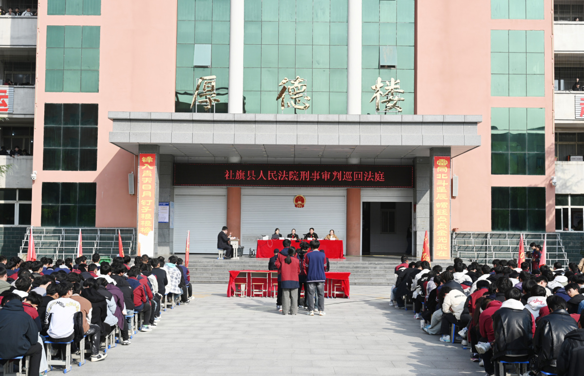 国徽高悬,庄严肃穆。11月5日,河南省社旗县人民法院将刑事审判巡回法庭“搬”进社旗县中等职业学校的校园内,公开审理并当庭宣判了一起因家庭矛盾引发的寻衅滋事案件。近3000名师生现场旁听,“零距离”感受法庭的庄严,“沉浸式”接受了一场深刻的法治教育。此次活动通过“巡回审判+以案释法+模拟法庭”的组合模式,在青少年心中播撒法治种子,筑牢预防未成年人犯罪的坚实防线。