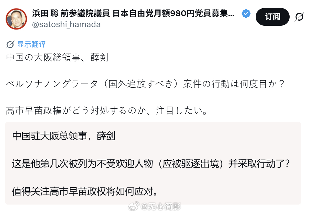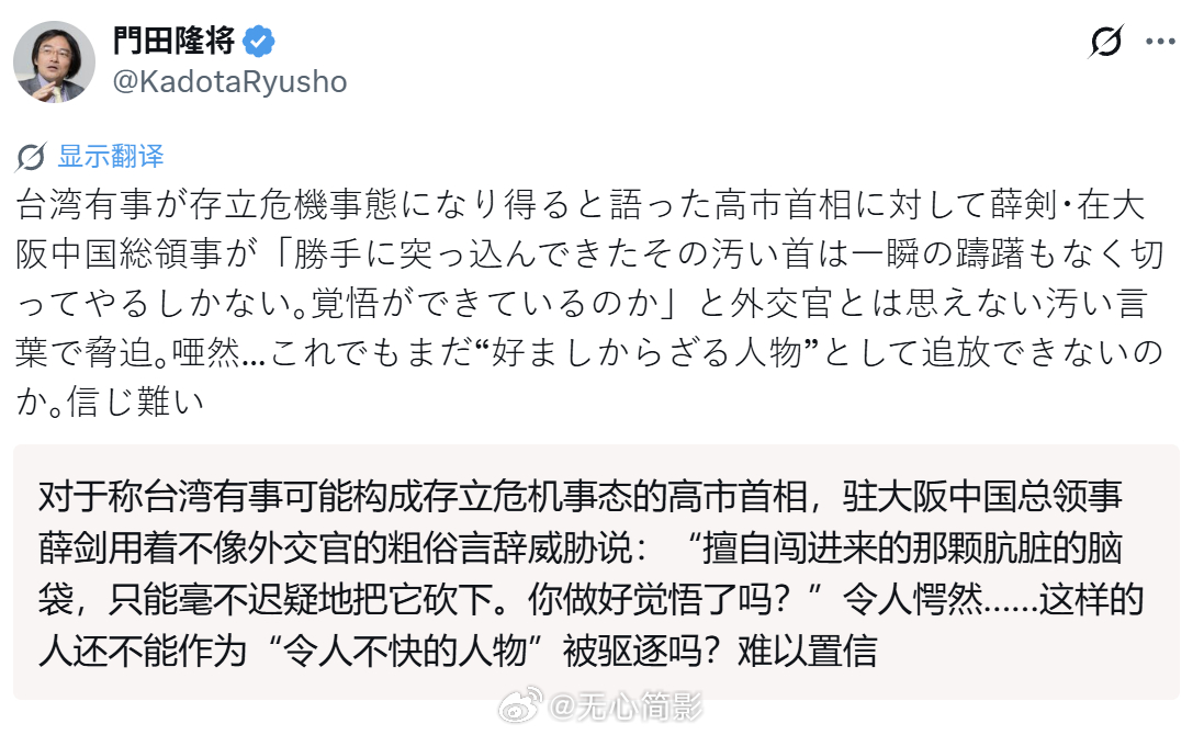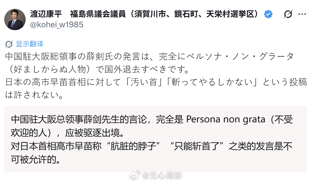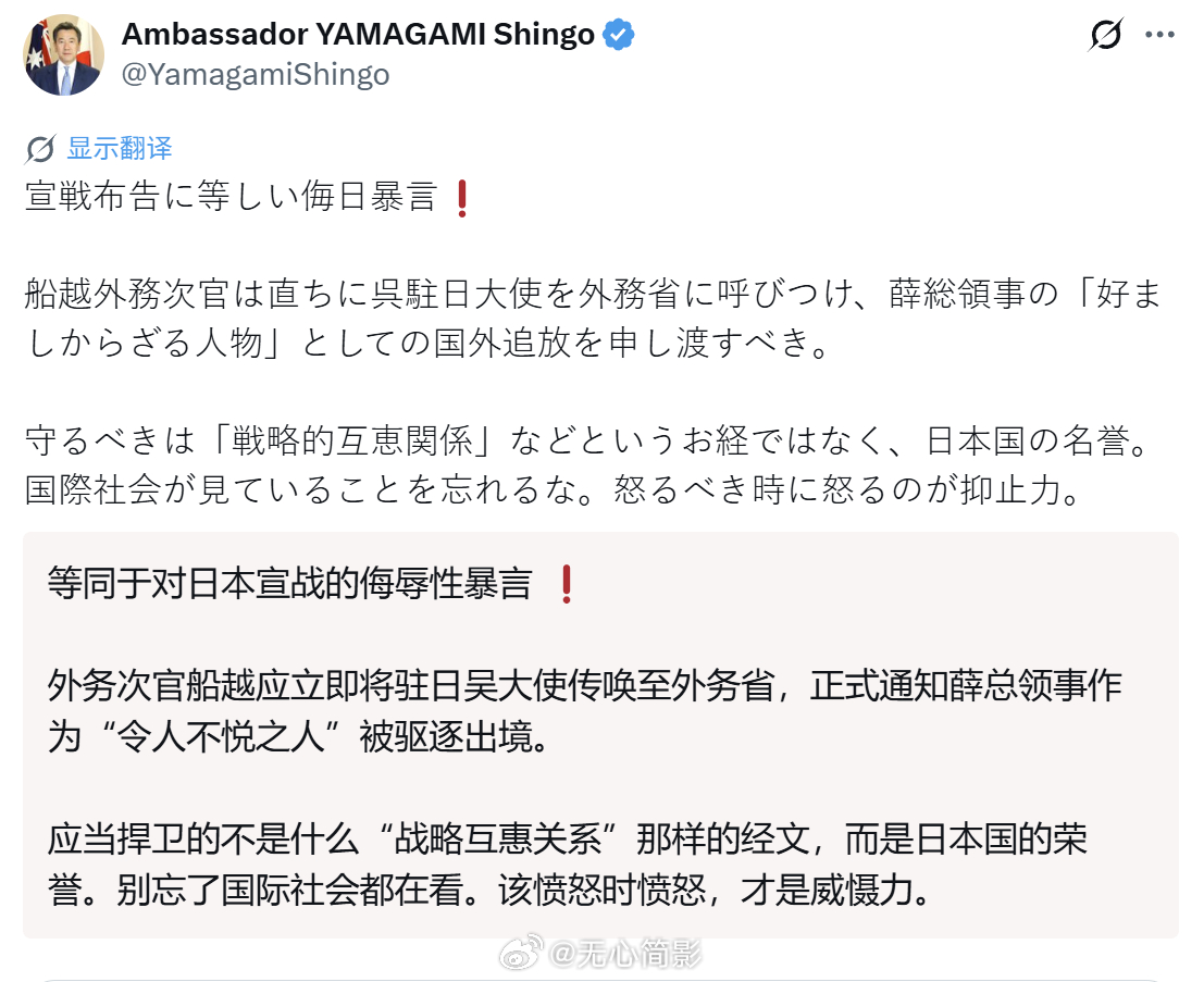 看看中国驻大阪总领事薛剑把日本人都气成什么样了,说薛剑是帖子是“等同于对日本宣战