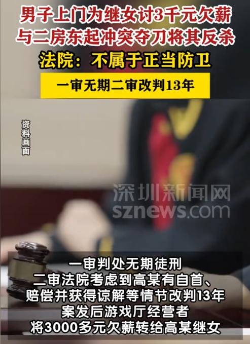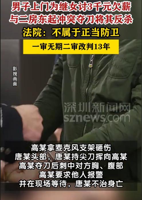 河南鹤壁,一女孩在游戏厅打工1个多月,被拖欠了3200元的工资。女孩向继父哭诉后,继父气得到游戏厅找老板讨说法,期间二人发生肢体冲突。男子先用麦克风支架砸伤了老板的头部,随后老板持刀挥刺反击,在二人争斗期间,继父抢过老板的刀捅向老板致其死亡。一审法院认定男子构成故意伤害罪,判无期。男子不服,认为自己是正当防卫为,于是提起上诉。二审判了! 高某待继女的好街坊四邻都看在眼里,当年他和妻子结婚时,姑娘才刚上小学,高某从没把“继”字挂在嘴边,书包亲自挑耐摔的,冬天的羽绒服总提前比着尺码买大一号,就怕孩子冻着。 转眼姑娘长成了大姑娘,想着假期去游戏厅打份零工,既能赚点零花钱,也能给家里减轻点负担,可一个多月起早贪黑干下来,3200元工资却迟迟没见踪影。 那天姑娘攥着空钱包回家,把委屈一股脑倒给高某,高某看着孩子憋得通红的脸,又心疼又上火,安抚好继女,高某揣着一肚子火气直奔游戏厅。 可到了地方才发现,店里空荡荡的连个人影都没有,他正站在柜台前犯嘀咕,楼梯口传来一阵急促的脚步声,上来的是个中年男人唐某,是一楼饭店的老板。 说起来也巧,这处商铺本是唐某女儿租的,二层转租给了游戏厅老板,一层则由唐某开了家家常菜馆,唐某在楼下听见楼上动静不小,怕影响自家客人吃饭,赶紧上来看看,没成想这一上楼就和满肚子火的高某撞了个正着。 高某见唐某过来,误以为是游戏厅的负责人,张嘴就问:“欠孩子的工资什么时候给?”唐某一头雾水,解释自己是楼下开饭店的,可高某正在气头上,根本听不进去,两人三言两语就吵了起来。 争执没两句,高某火头一上来,眼瞅着电脑旁立着个麦克风支架,伸手就抄了起来,朝着唐某的头就砸了过去,“咚”的一声,唐某额头瞬间渗出血来,他捂着伤口往楼下跑,一边跑一边回头喊:“你有种别跑!” 高某哪肯罢休,迈开腿就追了上去,到了一二楼的楼梯转角,唐某瞥见墙角靠着一把切菜用的刀,情急之下一把抓过刀,朝着高某就挥了过去。 万幸的是高某反应快,往旁边一躲刀没砍着人,可接下来的场面彻底失控了,高某往前一冲,一把夺过唐某手里的刀,反手就往唐某的胸口、肚子上连捅了好几刀。 唐某疼得直咧嘴,捂着伤口跌跌撞撞跑到一楼饭店大厅,顺手抄起旁边一把木椅想反抗,却被高某一把挡开,随后“扑通”一声直直倒在了地上。 直到这时高某才猛地回过神来,看着倒在地上的唐某,他赶紧喊饭店员工:“快打110!再打120!”自己则攥着刀跑到店外,把刀扔在路边草丛里,蹲在门口等着民警过来。 唐某被送进医院时,医生查出肝脏已经破裂,体内大面积出血,抢救了整整三个小时,最终还是没能救回来。 而另一边真正的游戏厅老板听说出了人命,吓得连夜通过微信把3200元欠薪转给了高某的继女,只是这笔迟到的工资再也换不回唐某的生命,也没法把高某从深渊里拉回来。 一审法庭上,高某红着眼眶坚称自己是“正当防卫”:“是他先拿刀砍我的!我要是不夺刀,挨打的就是我!”但法院审理后认为,高某的行为已经构成故意伤害罪,判处他无期徒刑。 高某不服,当庭就提起了上诉,这场案件的核心争议点也一下子聚焦到了“到底什么才算正当防卫”上。 咱们不妨翻翻《刑法》第20条,这里面把正当防卫说得明明白白:得是为了保护国家、公共利益,或是自己、他人的人身、财产权利,免受正在进行的不法侵害,才能采取制止不法侵害的行为。 简单说就是别人正在欺负你、伤害你,你才能用合理的手段保护自己,不是说只要对方先动手,你怎么反击都算正当防卫。 回到这起案子,有几个细节得拎清楚,首先冲突的根由是高某认错了人,把唐某当成了欠薪的老板,而且是高某先用麦克风支架砸伤了唐某的头,先动了暴力。 唐某拿刀挥砍时,高某不仅没受伤,还成功把刀夺了过来,这时候唐某手里没了凶器,对高某的威胁已经大大降低了。 可高某夺刀后没停手,反而拿着刀往唐某的要害部位捅,甚至在唐某跑到饭店大厅后,还追着不放,从法律逻辑来讲,高某的行为显然超出了“正当防卫”的范畴。 正当防卫的核心是“制止侵害”,不是“报复伤害”,要是高某在夺刀后把刀扔在一边,不再追着唐某,或许还能往防卫上靠靠。 可他拿着刀捅要害、紧追不舍的样子,明显带着“要伤害对方”的心思,这更符合故意伤害罪的构成要件。 不过二审法院也考虑到了案子的特殊情况,这起悲剧说到底是民间欠薪纠纷引出来的,不是高某故意找事。 唐某上来劝阻本身没毛病,但冲突能闹到这个地步,和高某认错人、唐某一时冲动拿刀也有关系,并且高某案发后没跑,还主动让员工报警,留在现场等民警,这算自首,到案后也认了错,还积极给唐某家人赔钱,取得了对方的谅解。 所以二审法院认为一审判得太重,撤销了无期徒刑的判决,改判高某有期徒刑13年,剥夺政治权利5年。