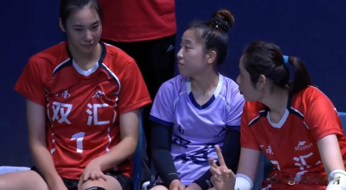 朱婷教练上线了!第一局休息期间,朱婷坐在凳子上,跟接应段梦可交流,小将听得也十分
