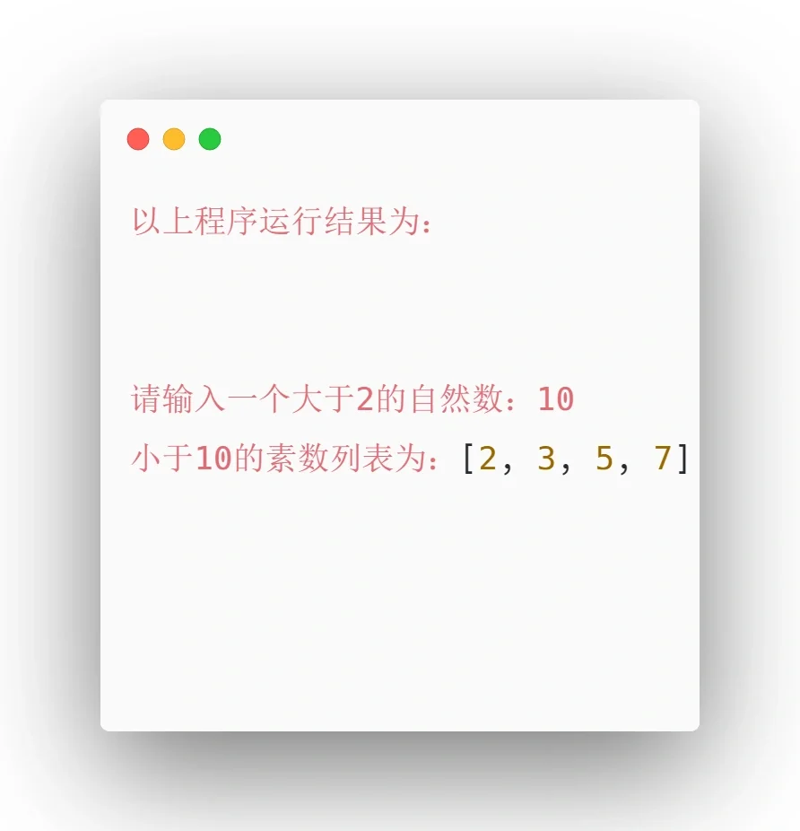 Python小项目[一R][三R][三R] ~ [一R]要求 使用列表实现筛选法求素数: 输入一个大于2的自然数,然后输出小于该数字的所有素数组成的列表。 ~ [二R]程序分析 本题的做法是🤔输入一个n ,先创建一个☝️长度为n + 1 的列表,将列表元素全部赋值为True,然后再去判断素数,如果不是素数,就在列表中将非素数对✅应的值修改为False,最后再用列表推导式,生成✌️值为True的元素构成的列表。 ~