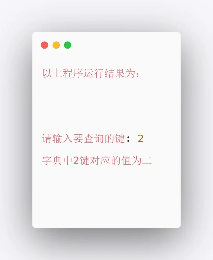 Python小项目[一R][三R][七R] ~ [一R]题目 编写程序,设计一个字典, 将用户输入内容作为“键”,输出字典中对应的“值”, 如果用户输入的“键”不存在,则提示“您输入的键不存在!”。 ~ [二R]程序分析 程序先新建一个☝️字典,输入要查询的键,通过✅keys()方法获取字典的所有键,再转为列表,然后再判断输入的键是否在列表中,如果不🤔在,说明该键不🤔在字典中,否则就在字典中,然后再通过✅get()方法找到该键对应的值。 ~