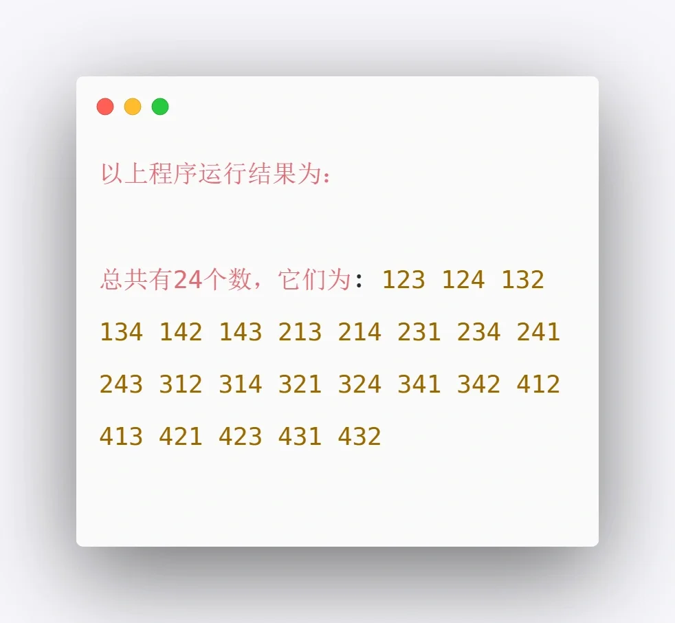 Python小项目[一R][三R][二R] ~ [一R]题目 找出整数1、2、3、4能组成多少个各位互不相同且不重合的三位数,并输出这些三位数。 ~ [二R]程序分析 既然是三位数,那么就需要三个for循环🔄,每一个循环🔄代表一位数字,然后再根据互不重复的条件找出这三位,再组合成一个数即。 ~