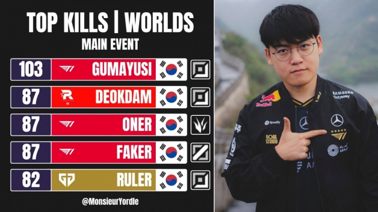Gumayusi以103排名本届世界赛第一位,deokdam、Oner、Faker均以87杀并列第二。