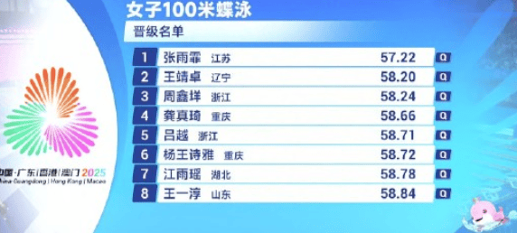 全运会女子100米蝶半决赛:张雨霏57秒22,头名晋级决赛