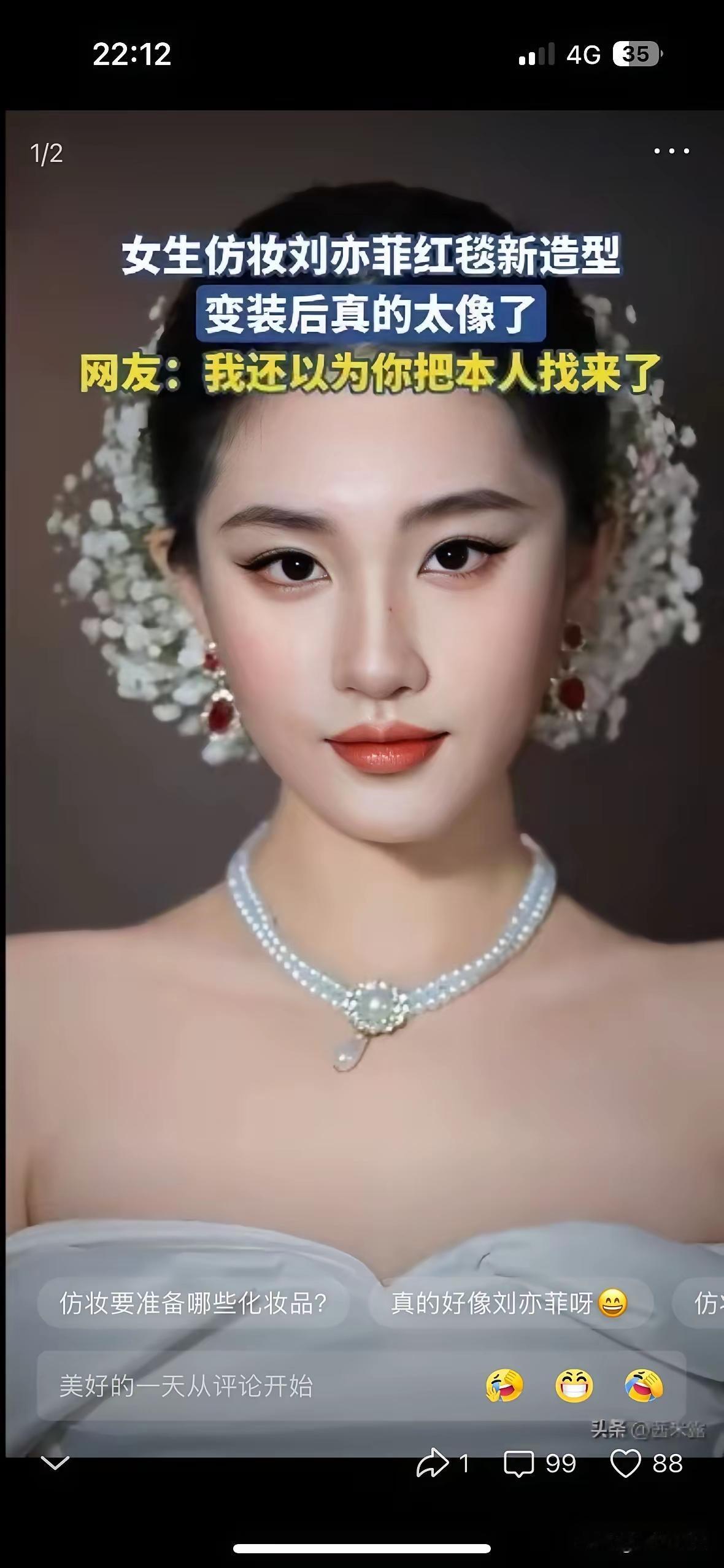 仿妆博主不比刘亦菲差,就是傲慢的劲头差了点。 搞笑的是,那博主的斜方肌都神似刘亦菲的[捂脸] 两人的都是视频截图,不存在P图。可见,这位博主的仿妆做🉐相当成功。而且,博主的状态显然更年轻化,脸蛋更饱满,眼睛更大一点,眼角向上,人中略短一点,眉毛画得略有不同……,所以,博主更像年轻的刘亦菲,像她20多岁时。