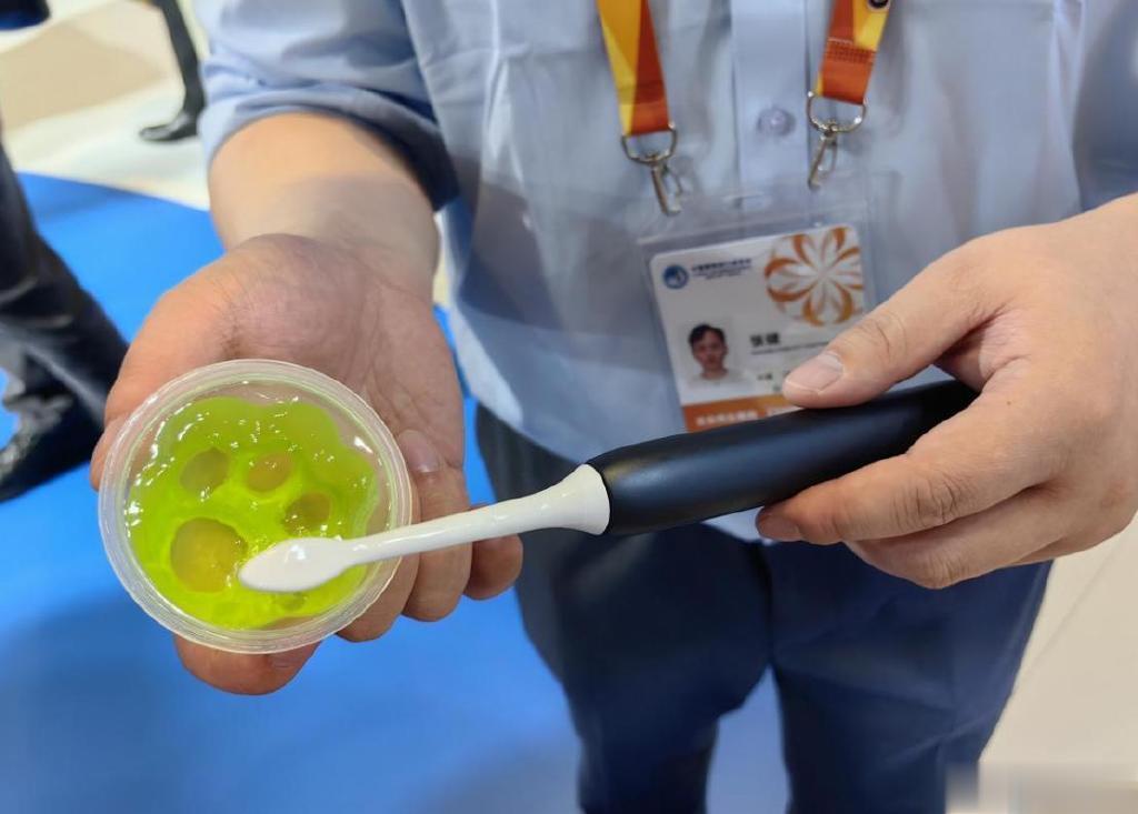 飞利浦展台工作人员展示为改善老年人牙龈健康设计的护敏牙刷。唐小丽摄