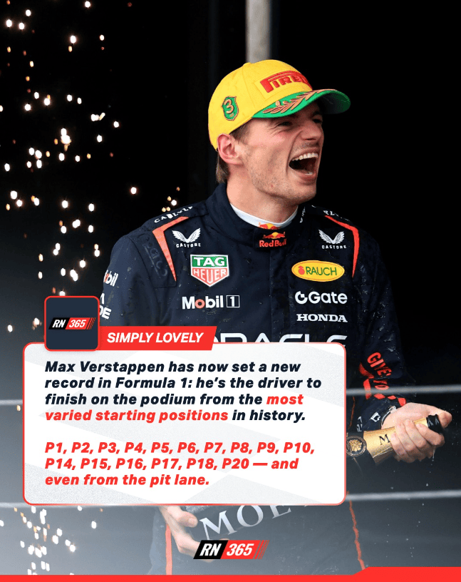 虎扑11月10日讯据RN365统计,红牛车手马克斯-维斯塔潘在F1圣保罗站从维修区出发,最终一路超车拿到季军,他在上演精彩逆转好戏的同时创造了一项纪录:从最多的不同发车名次发车并最终登上领奖台。