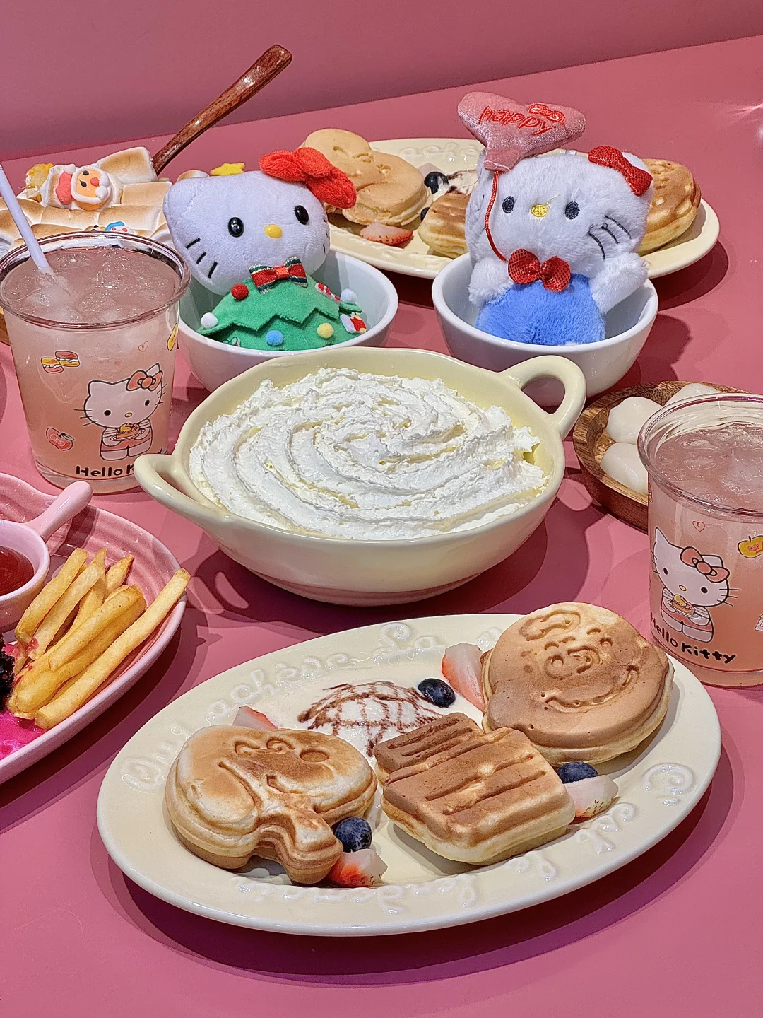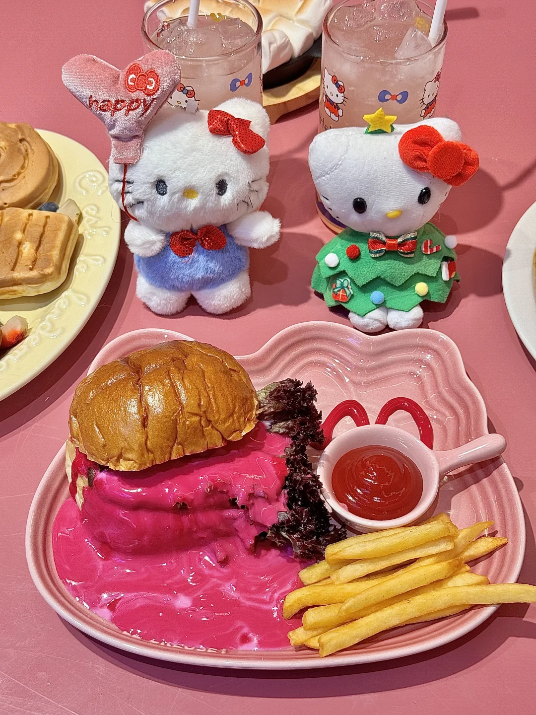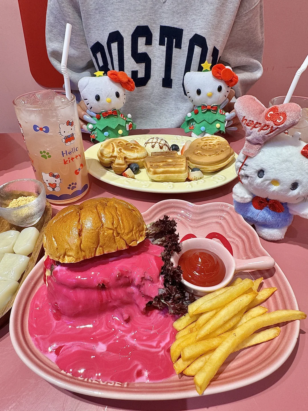 北外滩来福士新开的Kitty主题餐厅🍴 一整个芭比粉色系也太好看了吧!Kitty汉堡、气泡水🫧史努比华夫饼🧇炸鸡、还有奶油乌冬面…… 真服了没有一样不好吃🤤