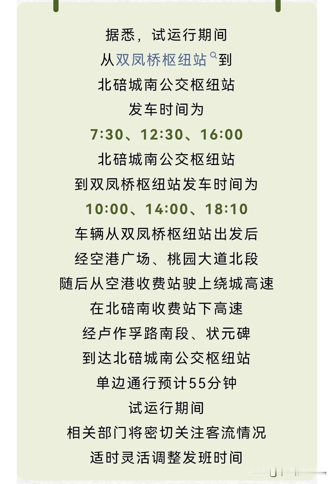 11月10日,北碚区正式开通两江新区双凤桥枢纽站到北碚城南公交枢纽站的公交线路图。 该线路目前是试运行阶段,每天3个班次,单程预计55分钟。 北碚区还是行动蛮快,这对北碚区人民来说是个天大的好事,他们去机场就方便多了。 北碚城区到大湾镇、统景镇、大盛镇兴隆镇、茨竹镇五地的公交线路就要先等一下了,期待相关部门早日开通相应的公交线路。
