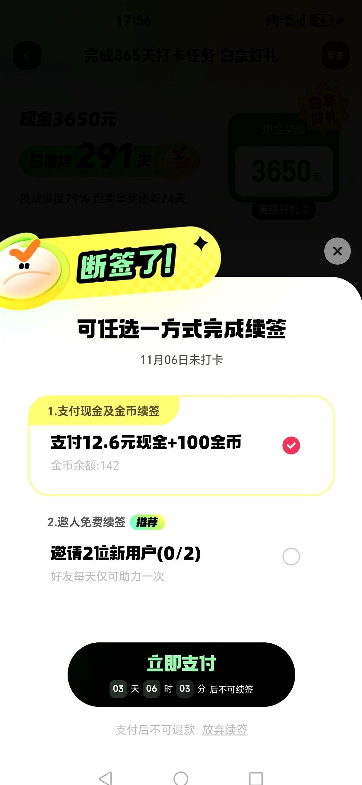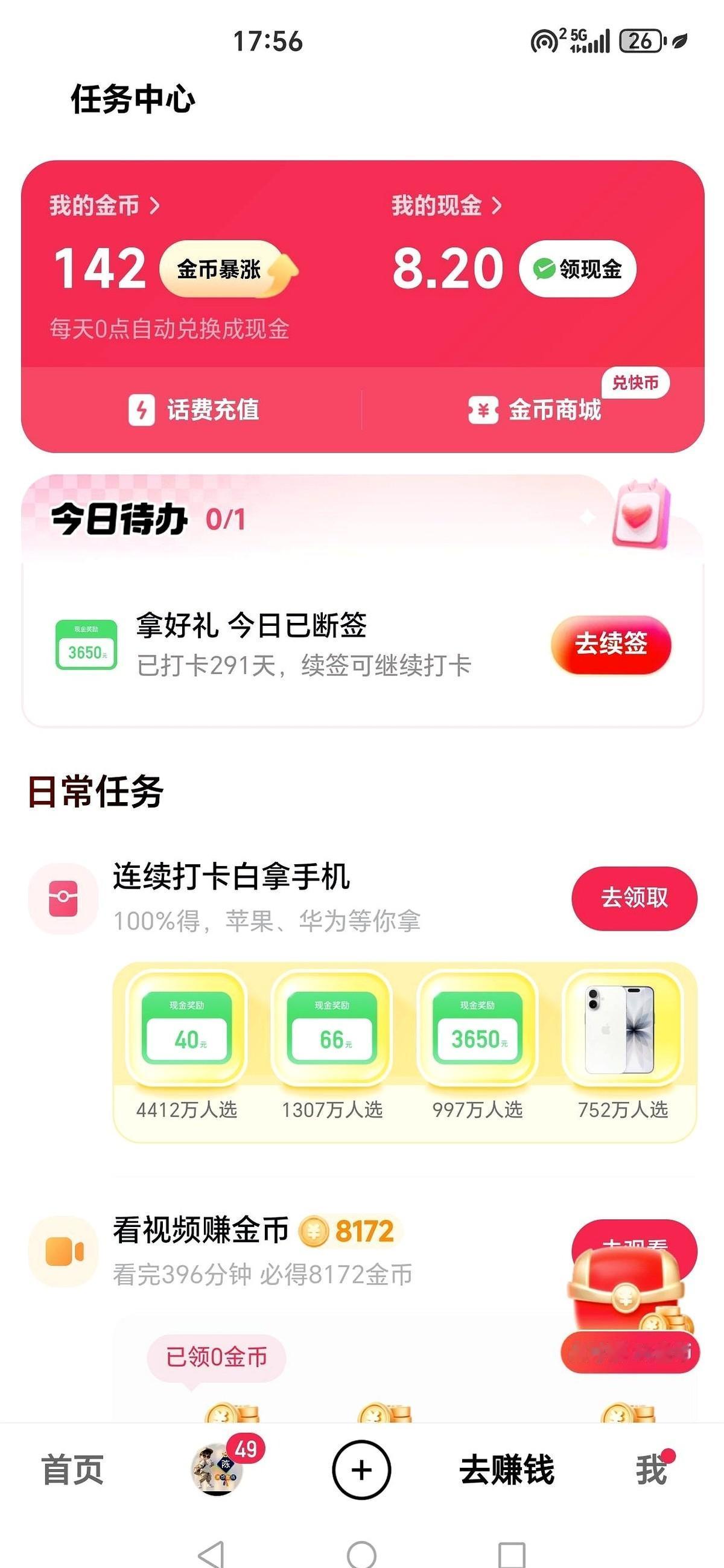 我,一个坚持了290天的傻子。 就为了抖音快手极速版那个“坚持365天”领钱的活