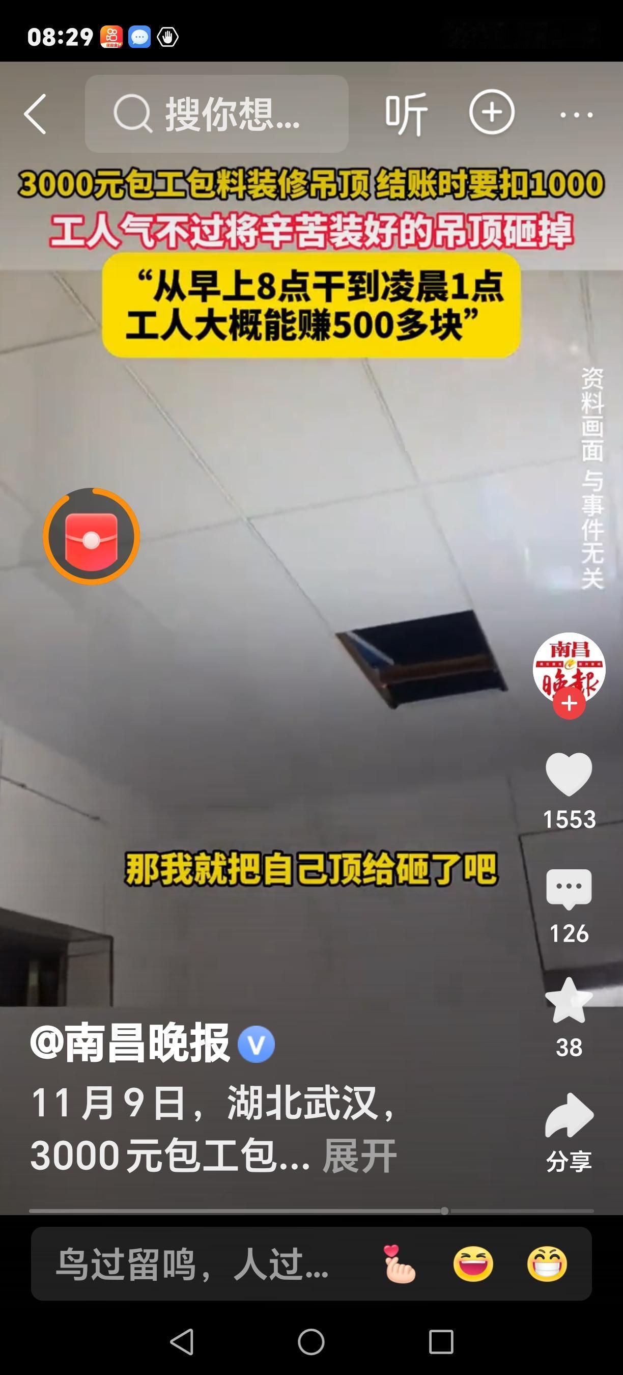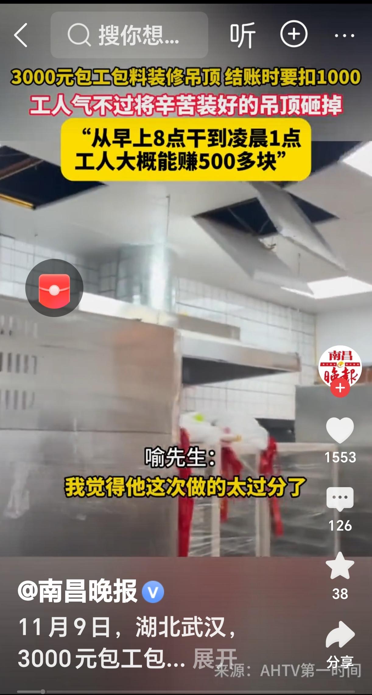 干17个小时工钱被扣1/3怒拆吊顶 您好,关于您干了17个小时后工钱被扣1/3