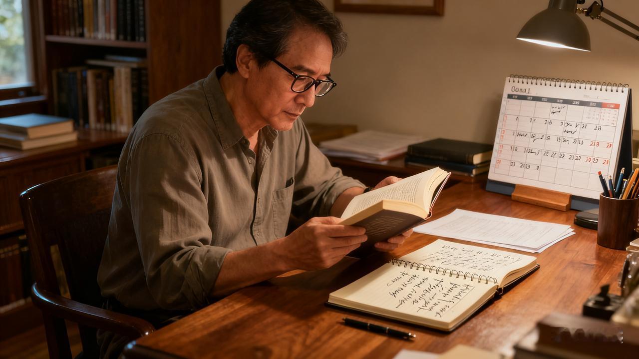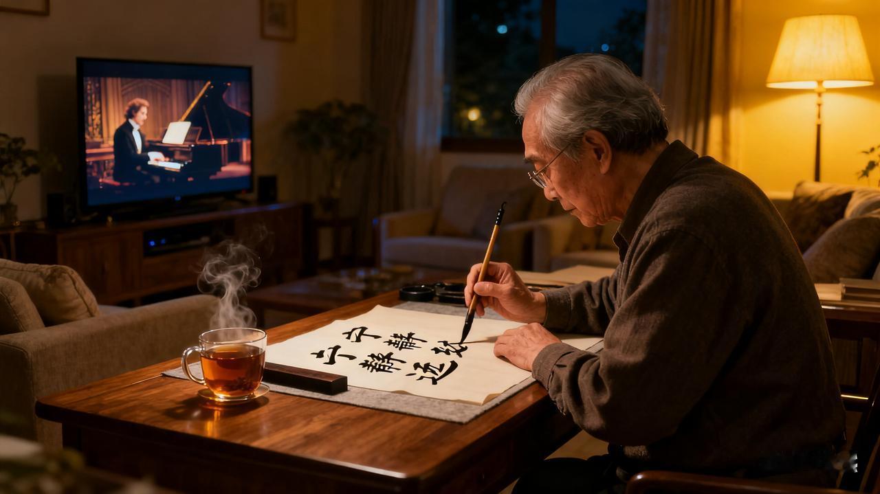 我将以图文形式呈现“规律且有支点的生活”主题内容 清晨阳光透过窗户洒进房间,一位年轻人正在做晨间瑜伽,动作舒展,神情专注。 整洁的书房内,中年人坐在书桌前专注阅读,桌上摆放着书籍和笔记本,墙上挂着日程计划表。 傍晚公园跑道上,一家三口在慢跑,父母牵着孩子的手,脸上洋溢着笑容,周围有散步的人群和落日余晖。 夜晚客厅里,老年人在灯下练习书法,桌上铺着宣纸和毛笔,旁边放着一杯热茶,电视播放着舒缓的音乐。