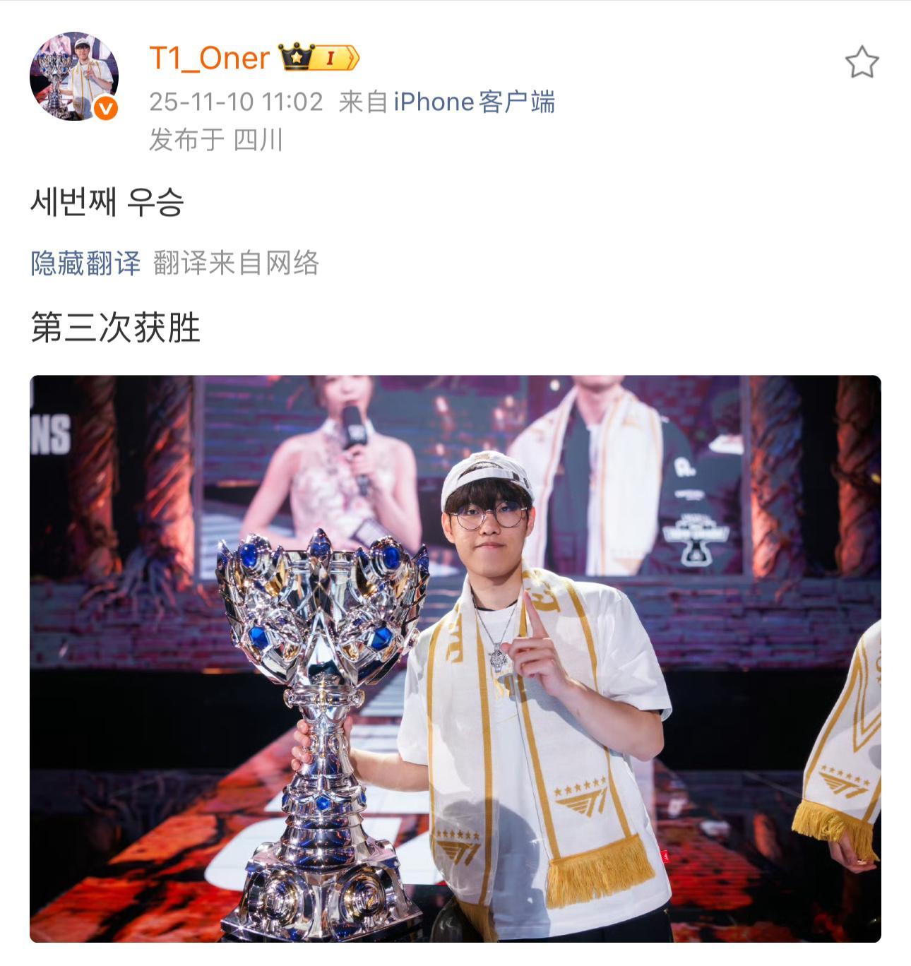 Oner发布照片[兔子][给你小心心]🐯t1战胜ktt1夺冠s15总决赛