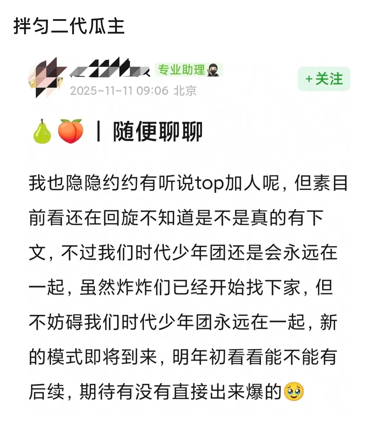 这个🍉 是这么一层一层炒起来的 刚开始传三代有大变动 昨天传出来说mzc要加入top 今天又有人出来说公式照就12号拍了 二代的🍉主也跑出来说